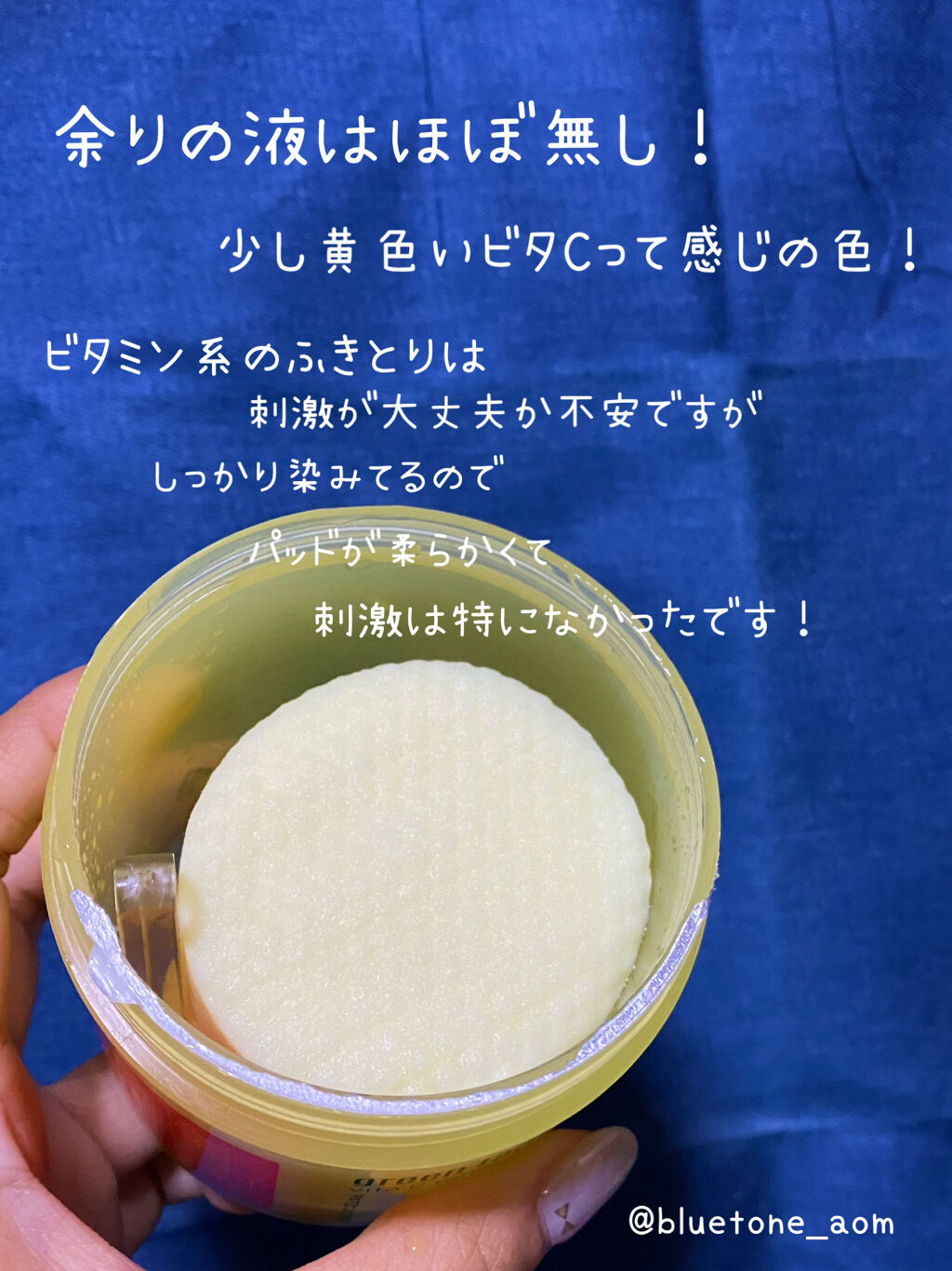 青みかん(グリーンタンジェリン)由来のビタミンCとフルーツ酸で優しく角質ケアさっぱりしていて気持ち良い✨なめらかな面で気になる部分をパックさらにエンボス面で軽く小鼻の周りなど拭き取り。くすみ、毛穴、ざらつきケアから保湿まで簡単ビタミンケア最後...