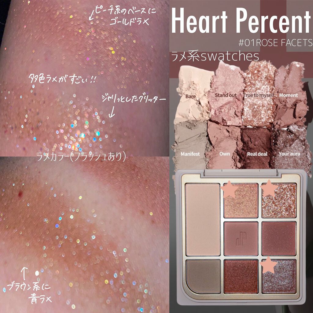 ※2023年12月開封品アイシャドウ・商品名HeartPercent(ハートパーセント)ドットオンムードアイパレット01ローズファセット・値段定価3630円(1628円で購入)・購入場所ドンキ・評価★★★★☆マット、ラメ、グリッターってバラン...