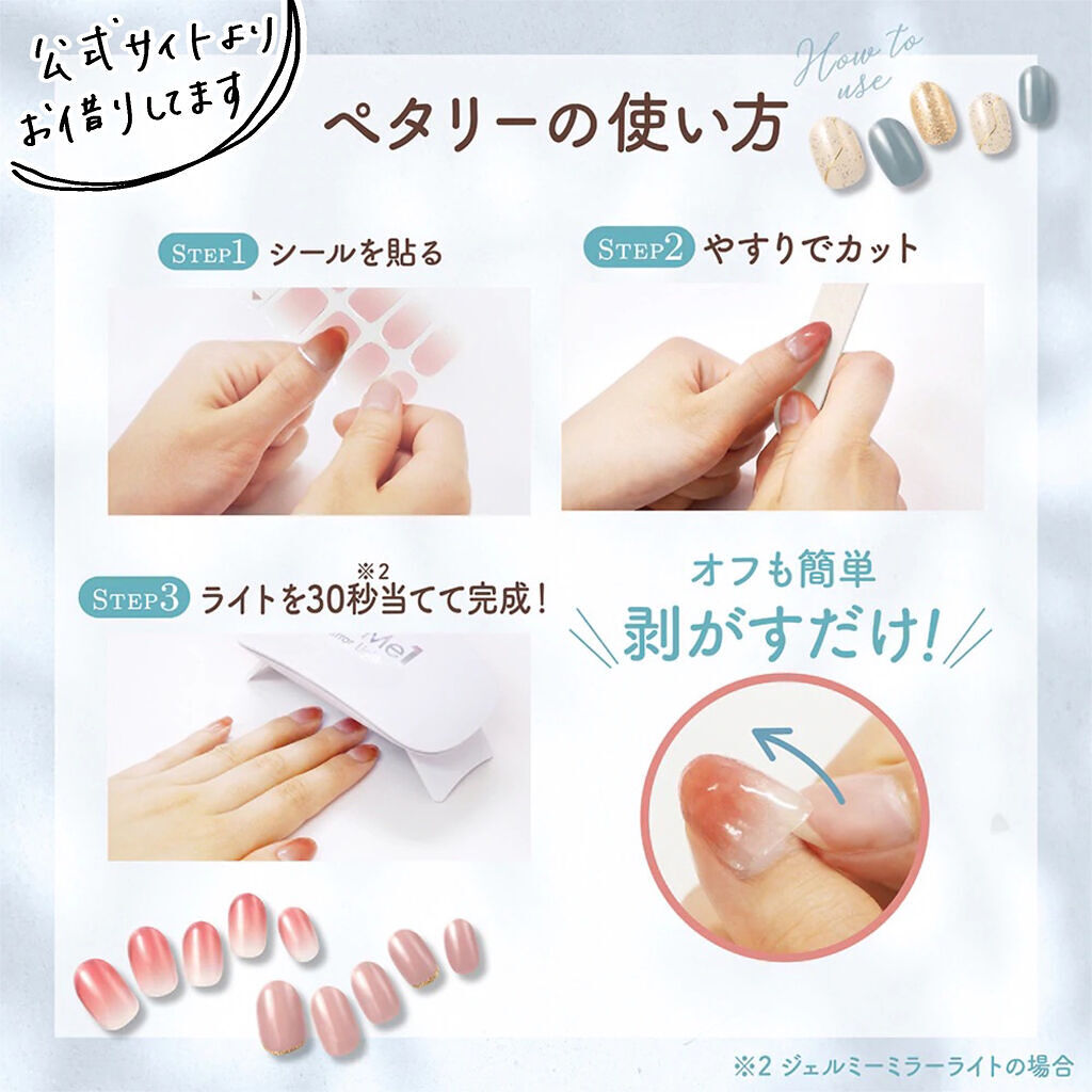 - おうちで長持ちジェルネイル『ジェルミーワン』から誕生した、硬化タイプのジェルネイルシール『ジェルミーペタリー』。貼ってライトを当てるだけで、簡単にサロンクオリティのセルフジェルネイルが楽しめます。 ジェルミーペタリー3つのポイント 〈Point1〉ぴったりやわらかフィット 柔らかさにこだわったシールは、高密着で爪に隙間なくフィット! 〈Point2〉70%リアルジェル配合 リアルジェル配合だからずっとツヤツヤ、自然で綺麗な仕上がり 〈Point3〉しっかり2週間*長持ち 水仕事にも強く、ぷっくり&ツヤツヤをキープしたまま2週間長持ち*でオフも簡単剥がすだけ! *個人差があります ※リニューアル履歴について:2023年3月4日(土)より一部バラエティショップ・公式オンラインショップ、2023年3月25日(土)よりその他全国のバラエティ・ドラッグストア・一部オンラインストアにてリニューアル発売