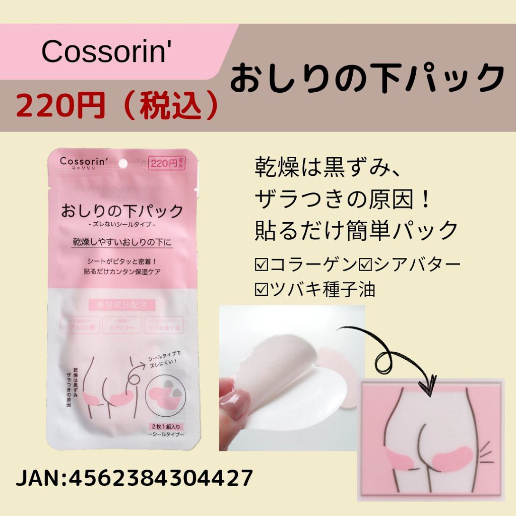 新商品のCossorin'(コッソリン)おしりケアシリーズ🍑 黒ずみやザラつくおしりをピーチの香りのスクラブせっけんで洗って、おしりパック♪ 美容成分、保湿成分配合なので、しっとりぷるぷるに✨ おしりも顔と同じように保湿ケアしましょうという商品です。 使った感じは確かににつるつるになります♪ パックは冷たいので、夏は気持ちいいかも😁 おしりクリームは、ニベアっぽい感じで保湿力高いです。塗布したあとは、ベタつきはなくすべすべしますよ❤︎ 4種類買っても、880円(税込)なので、夏までにおしりケアおすすめです♪