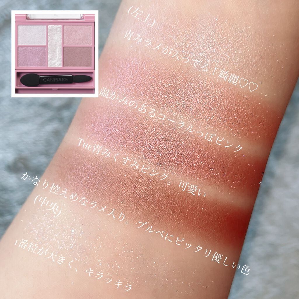 - 1枚のパレットで2つのスタイルが完成! 5色の欲ばりアイシャドウ♥ メインカラーを選んで2つのスタイルが楽しめる! A→B→D でスタイル1 A→C→D でスタイル2 繊細な粉質が、しっとりとまぶたに密着して色落ちを防ぎます。 透明感のあるキラうるトッピングジュエル(繊細ラメ)は、気分によってトッピング!