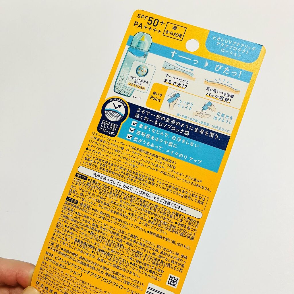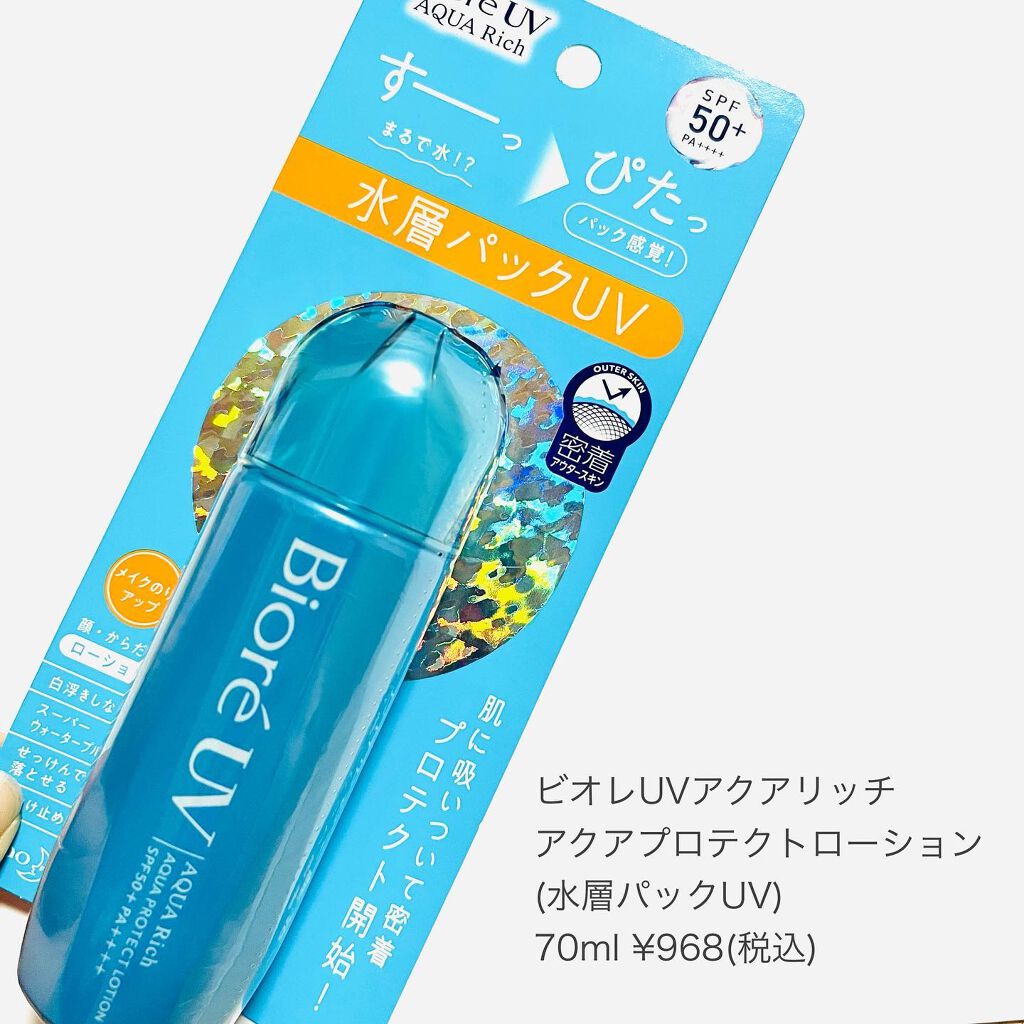 ビオレUVアクアリッチアクアプロテクトローションを使ってみたよ🩵SPF50+PA++++顔とからだ両方使用可!メイクのりをUPさせてくれて、水光肌みたいなツヤ感も出るから気に入ってる🩵UVカット成分が含まれたアクアカプセルが入ってるよ✨想像よ...