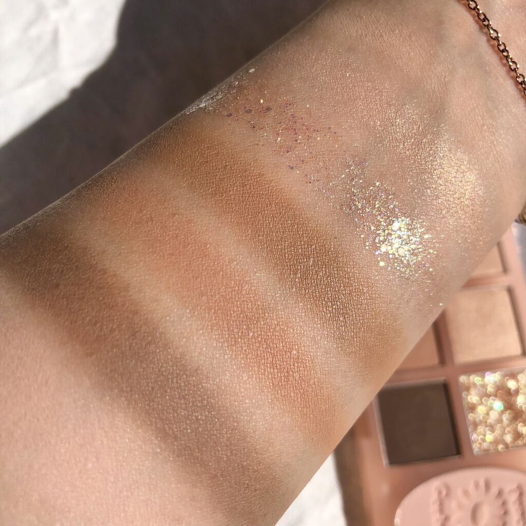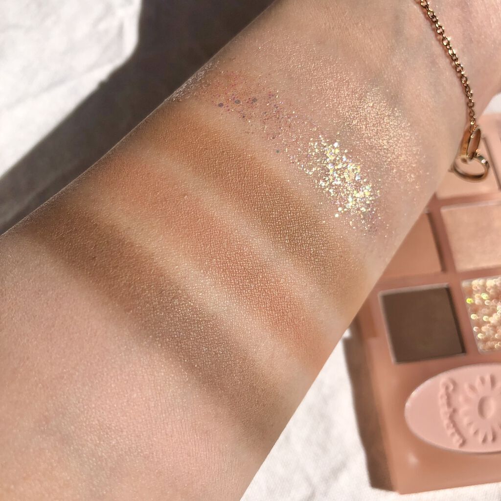 ピンクブラウンパレットって感じでイエベ春向きかな。 小さいしひとつで普通にアイメイクが完成するから旅行とかに持ってくのにも良き👍⭐️ マットの方は割とピンク!ブラウン!って感じに発色する!