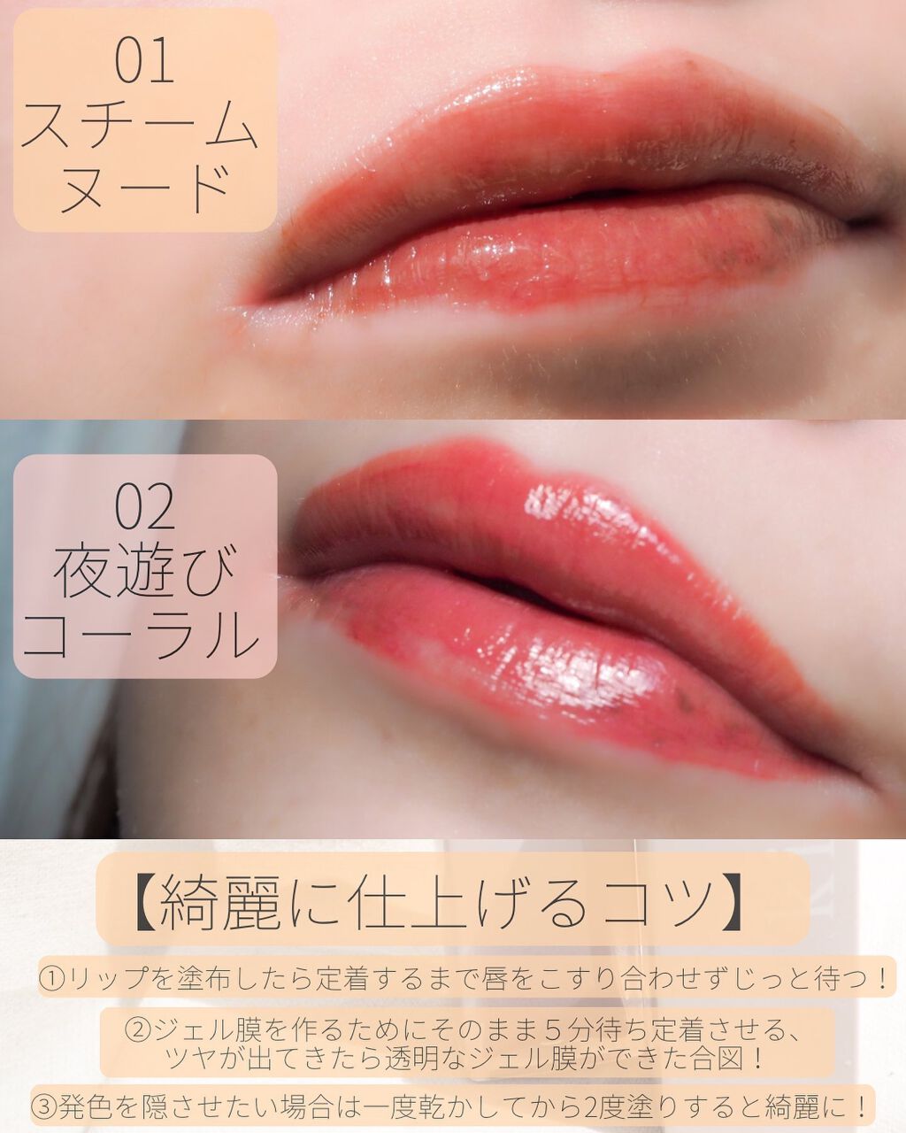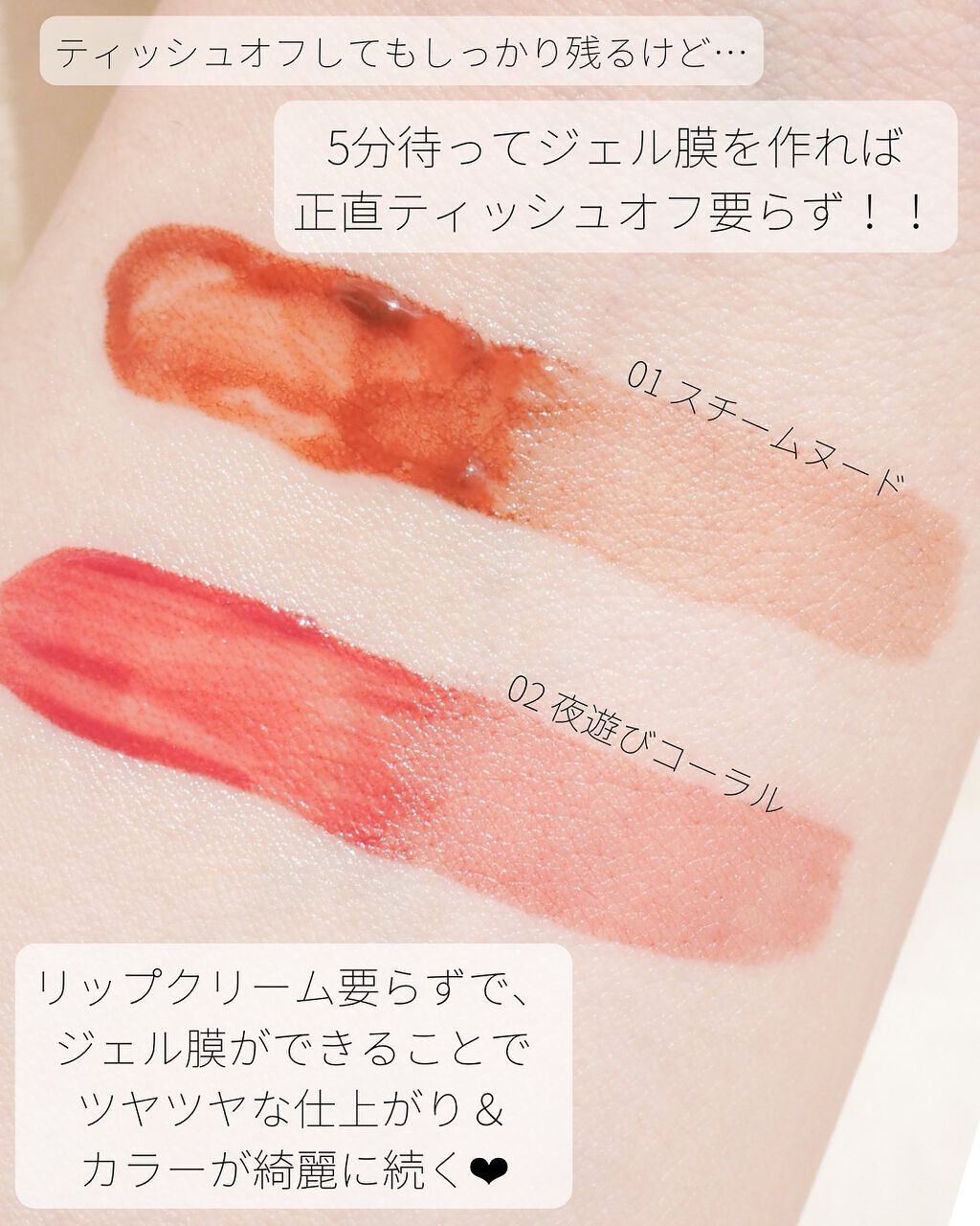 | 指で軽く触るとジェル膜を感じられますし、ツヤツヤぷるぷるのリップに仕上がります! | 詳細を見る | ||