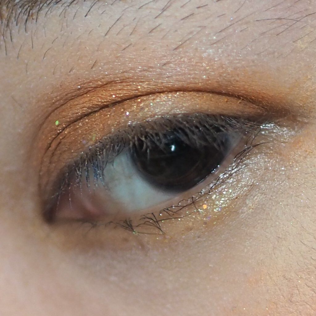 左上のラメは、ゴールドにちょっとピンクがかった?色で派手さこそ無いものの、しっとりとした粉質で瞼に優しく光をくれます。 右上の明るいブラウンは、中間色として使えそうです。ココアのような色でもあるのですが、イエベでも使えます。 左下の濃いブラウンは、締め色として使えます。アイライナー代わりに入れても良さそう。 右下のオレンジは、パッと華やぐ色です。透け感のあるオレンジなので、オレンジメイクが苦手!という方でも使いやすいカラーです。 全体的に温かみのあるカラーで、秋らしいカラーかなと思います。また、透け感が強いので、いかにもマット!というアイシャドウが苦手な方でも使いやすいパレットかと。