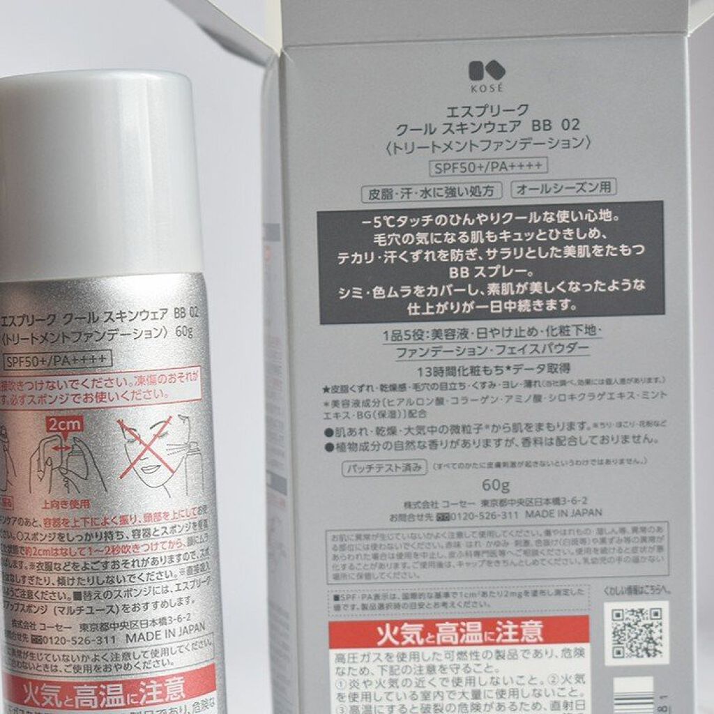 - クールな使い心地で、サラッと毛穴レス※。※メイクアップ効果による 1本で、シミ・色ムラもカバーし、なめらか均一肌が続くBBスプレー。SPF50+ / PA++++ ■ -5℃タッチで毛穴の気になる肌もキュッとひきしめ。 素肌そのものがきれいになったかのようななめらか均一肌を、一日中キープするBBスプレー。 ■ シミ・色ムラを自然にきちんとカバー。 カバー力が高い色ムラカバーパウダーを新配合。粉体自体が肌なじみにこだわったベージュのカバー粉体なので、自然な仕上がりでありながらも高いカバー力を叶えます。 ■ 化粧膜の密着力を高めることで、自然で高い毛穴カバー力を実現。 板状粉体と球状粉体の複合粉体が、肌への密着度が高く効率的に毛穴をソフトフォーカスします。ポアコンシールゲルによって均一な厚みのある化粧膜となり、毛穴カバー効果を高めます。 ■ マスクにつきにくく、美しい仕上がりを長時間キープ。 顔料に疎水処理を施した、マスクにつきにくい成分を配合することで、マスクへの色移りを低減。 皮脂・汗・水にも強い処方のため、蒸れやすいマスク内でも二次付着しにくい処方です。 ■ 紫外線だけでなく、肌あれや乾燥、大気中の微粒子(ちり・ほこり・花粉など)からも肌を守ります。 ■ 1品5役(美容液・日やけ止め・化粧下地・ファンデーション・フェイスパウダー) ■ スジやムラができにくく、肌に均一にしっかりと塗布できる専用スポンジ付き。 ■ パッチテスト済み ※すべてのかたに皮膚刺激が起きないというわけではありません。 ■ 無香料。植物成分の自然な香り。