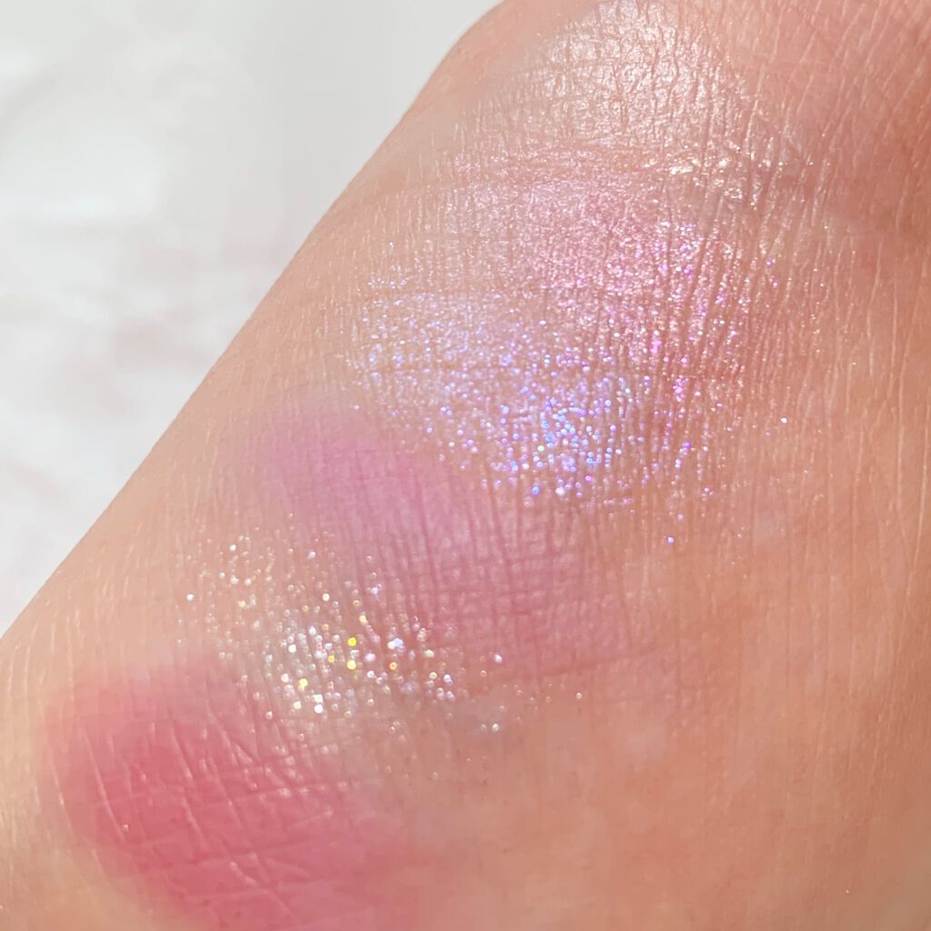 全25色(うち限定4色)の中から4つを選び、自分だけのパレットを作れるというコンセプトなのですが、単色でもケースに入ってるので1色のみを買いました。 RS 154 ローズスターダストは透明感のある輝きラメカラーという種類で、まぶたの中央や涙袋に重ねてきらめきのアクセントになるものです✨ 塗ってみると、ギラギラとまさに流れ星のようなスパークルの輝き🌟 ピンク・ブルー・イエローが光る多色ラメで、とにかく可愛すぎるの一言!