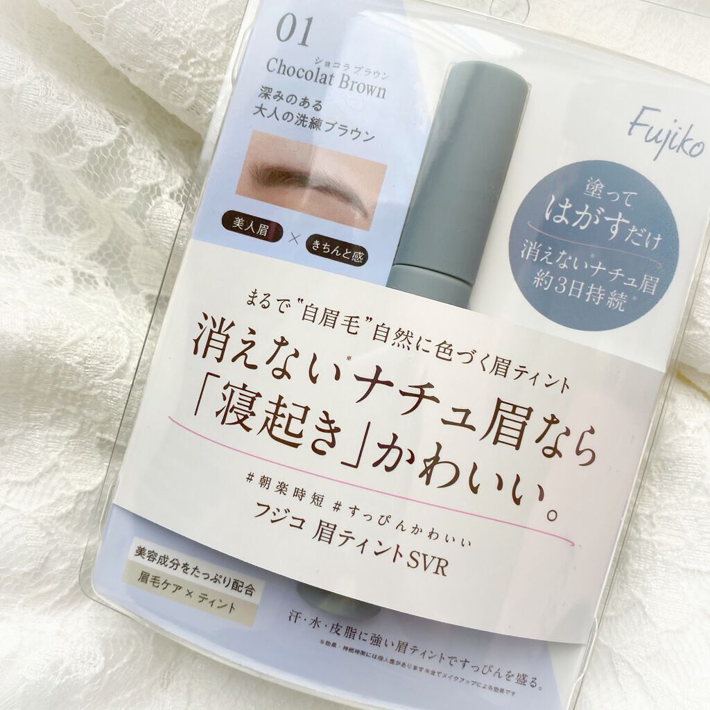 フジコ眉ティント 01ショコラブラウン 1,485円 (税込)です。眉ティント??ちょっと使いにくそう……、めっちゃ濃くなるのでは?って思ってたけど、これがすっごく使いやすかった✨ カラーが絶妙だから垢抜け眉にもおすすめ👀💓 私のおすすめの使い方は、眉のベースに眉ティントを仕込んでおくこと! 5種の美容成分が配合されているから特に荒れることはなかったよ🌸