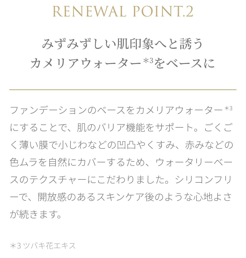 - 素肌に溶け込むようになじみ、みずみずしいツヤときめ細やかさ、クリアな透明感 *1 をもたらす ボタニカルクッション。 紫外線やブルーライトなど現代の肌が受けやすいダメージを捉え、保 護しながらうるおいを持続させる力がパワー アップしました。 カメリアオイル*2 をはじめとした植物性保湿成分を贅沢に配合し、まるでスキンケアのように肌を整えながら、小 じわや色ムラを薄膜でカバーし美しいツヤ肌をつくり上げます。 ベルガモット*3とゼラニウム*4 のアップリフティングな香り。 *1 メイクアップ効果による *2 ツバキ種子油 *3 ベルガモット果実油 *4 ニオイテンジクアオイ花油