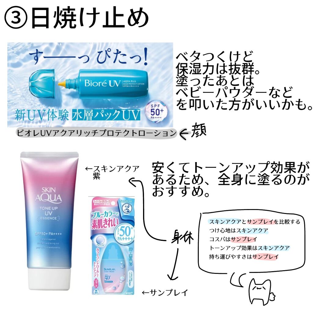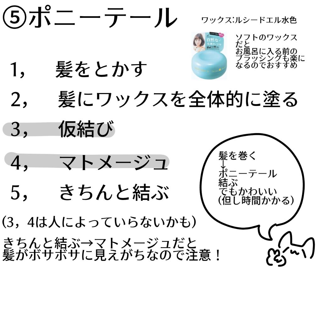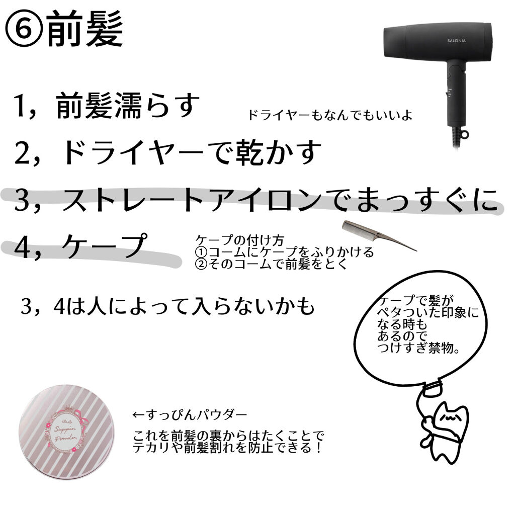 洗顔料は自分の肌トラブルにあったものを。 ビオレUVアクアリッチプロテクトローションは保湿感◎。日焼けも他と比べて圧倒的にしにくい。 あぶらとり紙よりも粉を叩いたほうが仕上がりが綺麗。 ポニーテールは高めの位置で結んだほうが可愛らしい印象があります。 前髪は寝癖がひどいので髪を濡らしてリセットしています。 最近はマスクで隠れていますが唇がカサカサよりかはプルプルの方が良いと思いますのでリップケアもきちんとすると◯。
