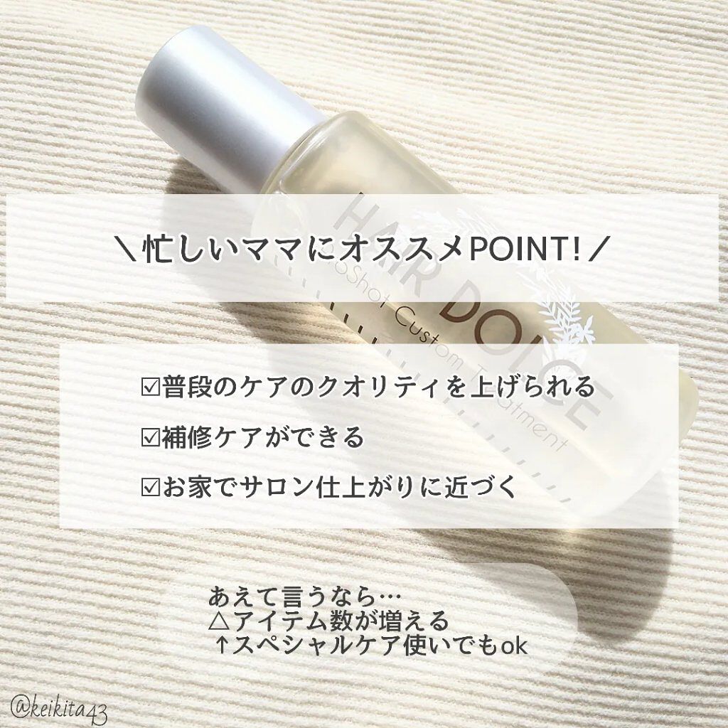 高評価だったヘアドルチェ🤍 トリートメントの前に使ったり混ぜたりできるから使い勝手◎ これ単品だと時間置かなくてもいいのもありがたい! 髪の毛が強くなったというか、コシがでてきた感じがする🙌🏻💗 日頃のダメージケアに取り入れるのがいいと思った!