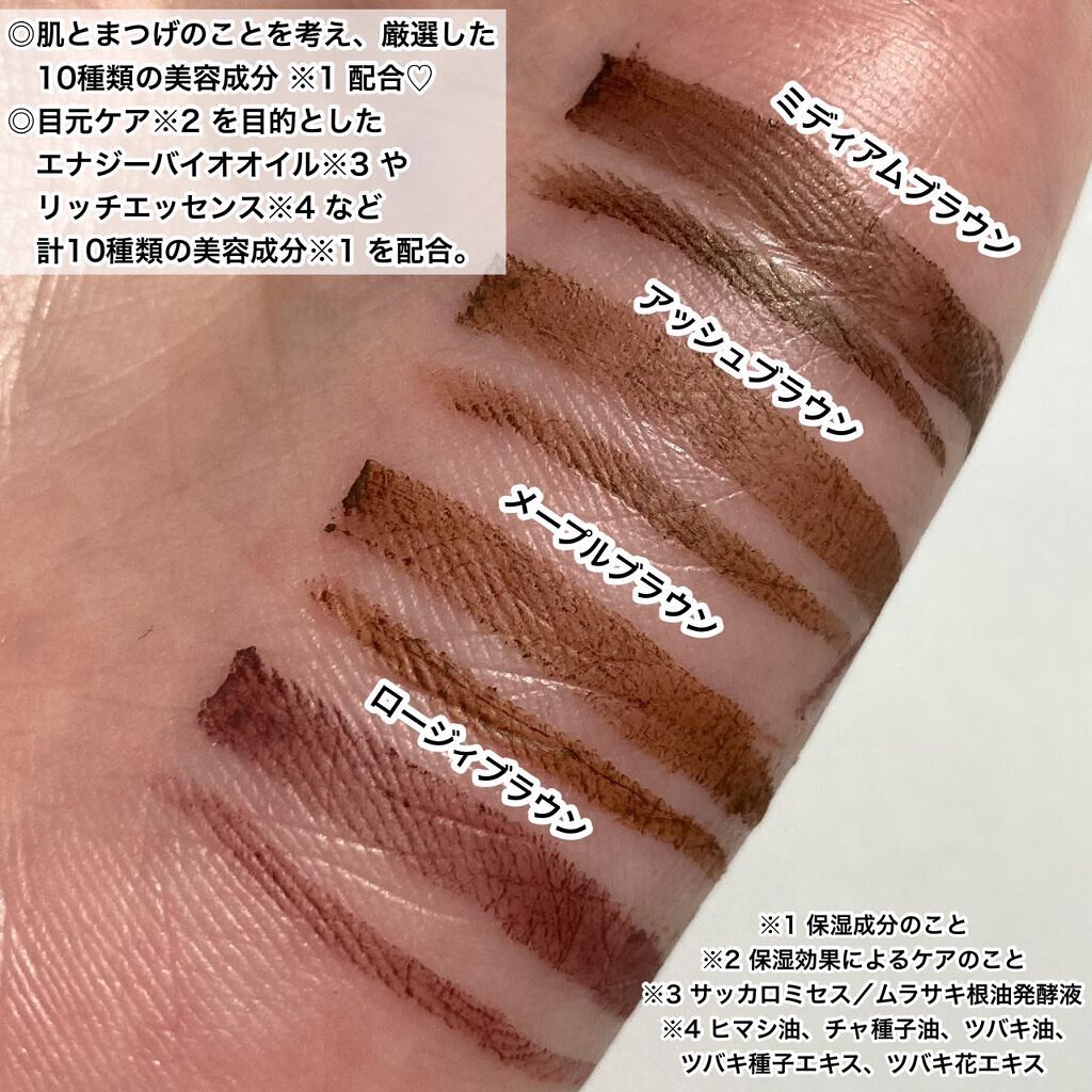 - 肌あたりがまるでクリーム。するする描けて一日中崩れない。※1 ■長さと重さを付けた新形状の繰り戻し可能容器で、手ブレしにくく描きやすさアップ。 ■ドロースムース設計で密着成分と揮発成分が顔料を包み、なめらかな描き心地を実現。 ■汗・皮脂・涙・こすれに強いWプルーフ設計。 ■美容成分※2 を5種類から10種類にアップ。 ※1 社内試験済。効果には個人差があります。 ※2 保湿成分のこと <カラー展開> ■ミディアムブラウン 陰影のある目元を作る黄み寄りのビターなブラウン。洗練された大人の存在感を。 ■アッシュブラウン ほんのり赤み系ブラウンでふわっと自然な抜け感。ほの甘く、柔らかな表情に。 ■ロージィブラウン 華やかで印象的なくすみピンクブラウンで血色感のある目元に。 ■メープルブラウン オレンジ系ブラウンの透け感ラインで、目元にピュアな明るさを。 \2023.9 new/ ■ブラック 目元をくっきり強調する洗練カラー。