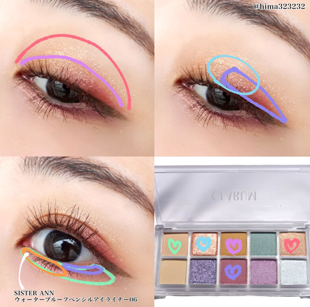 ①指でベタ塗りしない ②濃い色を広く入れすぎない ③目頭側に広く色を入れない ④下目尻は2色混ぜて使う ⑤色の境目はぼかすorラメをのせる ⑥涙袋の影は入れすぎない ⑦涙袋にラメを乗せすぎない ⑧マスカラ・グリッターはつける量を調節する ⑨マスカラのダマはコームでとかす ⑩アイラインは目尻だけ