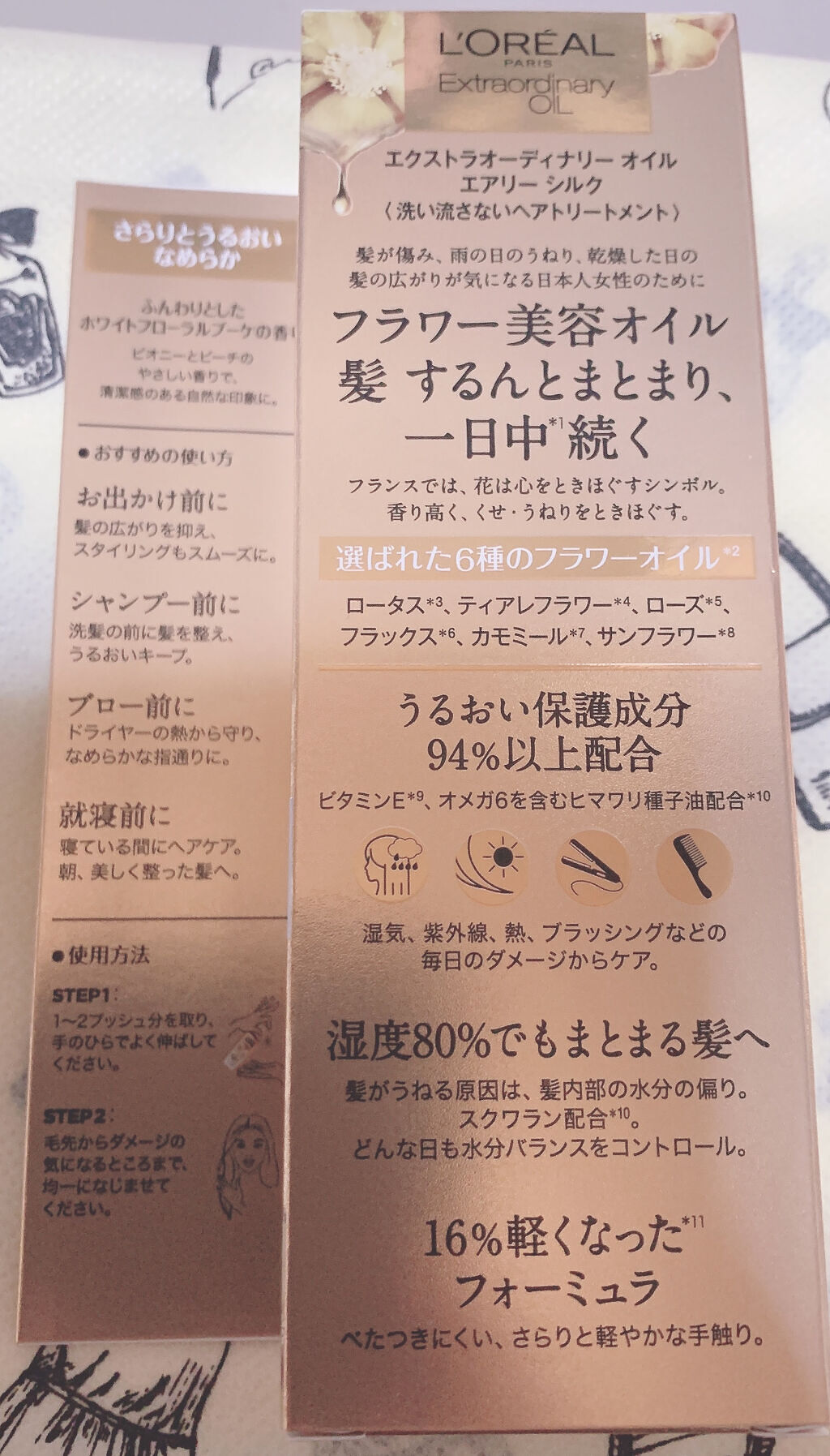 やっぱ名品だった!するんと軽やかなヘアオイル💛✨《ロレアルパリ》エクストラオーディナリーオイルエアリーシルク♡商品情報16%軽くなった*新ヘアオイル。(*ロレアルパリ従来品比)ヴェールのように薄付き。指通りするんとサラサラ、湿度80%でもまと...