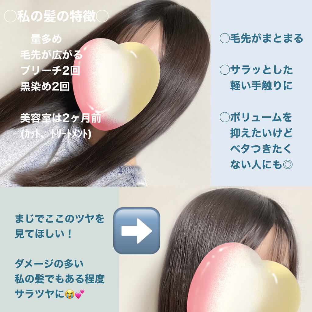 ◯香りがめちゃくちゃ好き!清楚な女の子のにおい❄️真っ白な花束〜って感じでおんなじ匂いの香水が欲しい、、、ほんのり香るので、他の香り系のアイテムの邪魔をしないのもポイント高い! ◯サラッとした軽い手触りにちゃんと潤いはあるのに、ベタつかずに髪をサラサラにしてくれる重めのオイルが好きな人には物足りないかも ◯ボリュームを自然に抑えてくれる私の髪は広がりやすく、量が多いのですが綺麗にまとまってボリュームをさりげなく抑えてくれました! ◯ツヤツヤになる画像じゃ伝わりにくいですが、髪にツヤが出た、、、🥺✨ちなみに美容室も最後に行ったのは2ヶ月前でシャンプーも市販の1000円しないやつです!