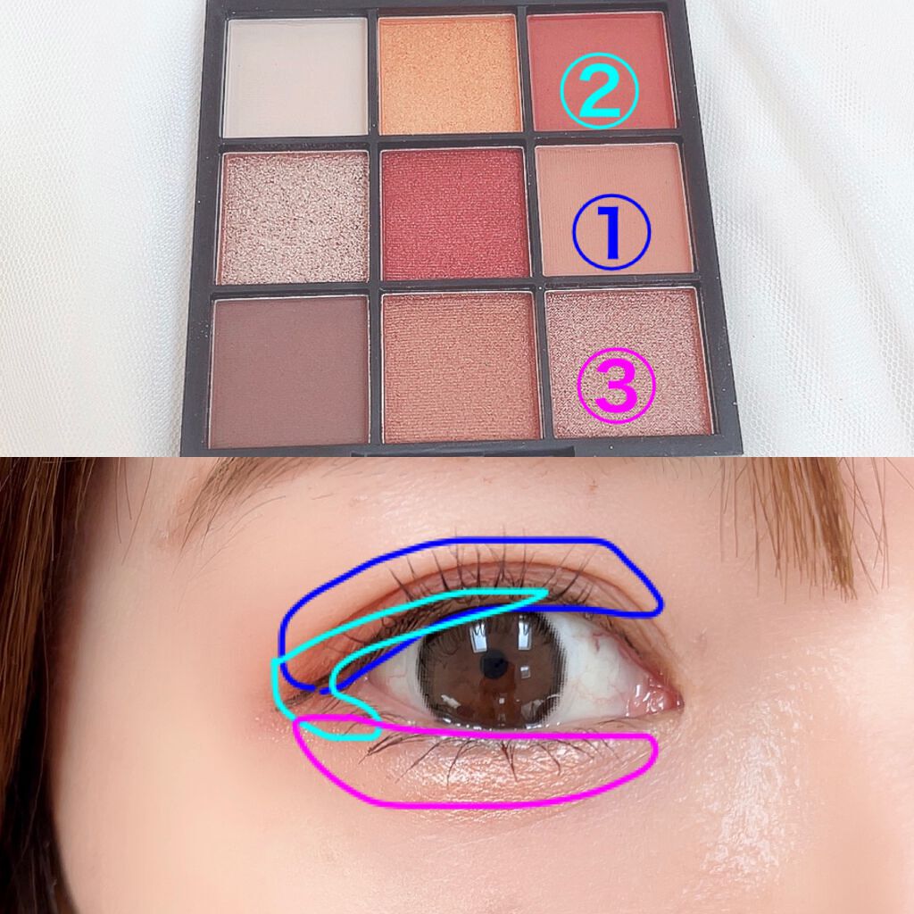 【今日のメイク備忘録】今日はユーアーグラムのアイシャドウ、ブルーミングアイカラーパレット01aを使って、コーラルピンクメイクをしてみましたちなみにカラコンはOLENSのBIGGLOWYのラベンダーです✡やり方✡1.①をアイホールにのせる2.②...