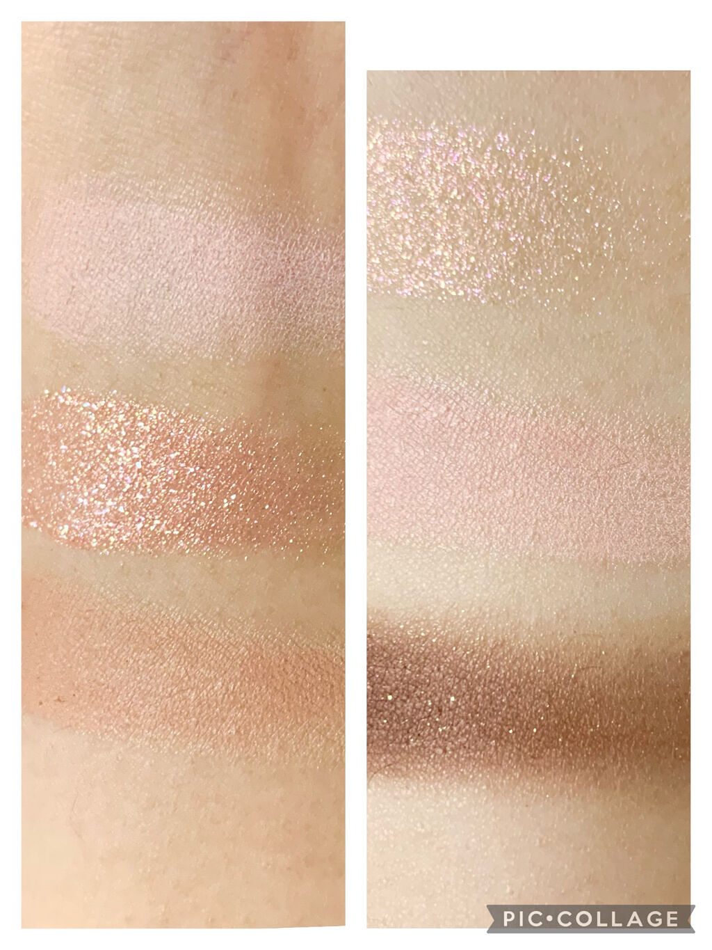 上2色は立体感を底上げするしっとり質感の高発色ミュートマット✨ 自然になじんで目もとを大きく見せるくすみ系のカラーです 下の2色にはラメが入っていて、 左下は細かく繊細なツヤ感、 右下は大粒グリッターで存在感があり少量でもキラキラ✨ 全体的に淡いカラーでガツンと発色しすぎないので普段挑戦しにくい色味も挑戦しやすいんじゃないかな🤔