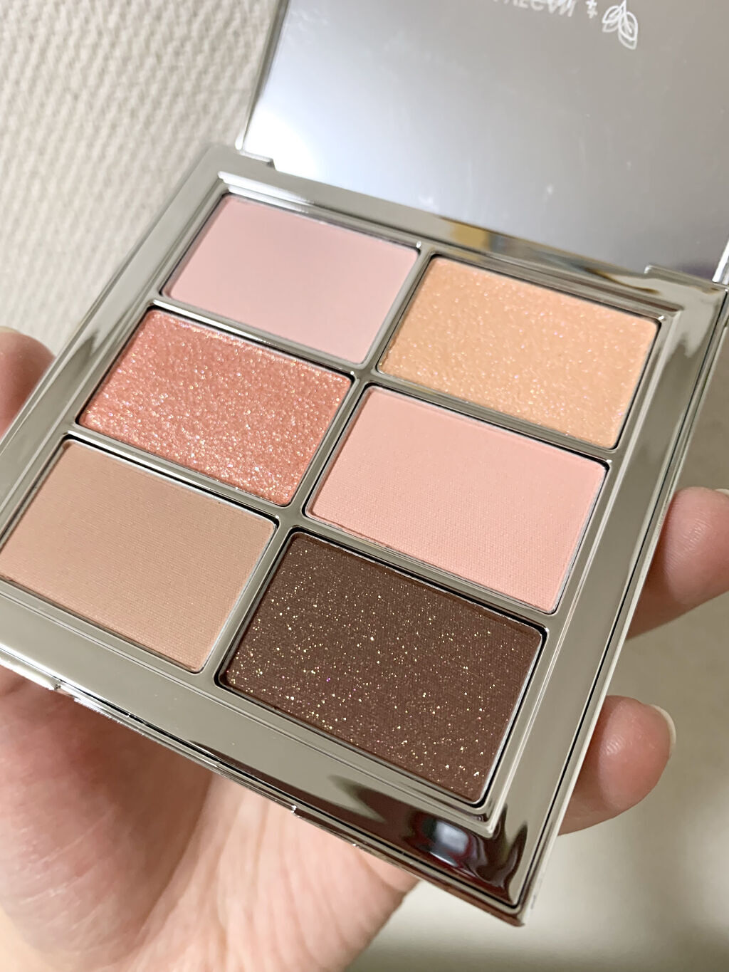 - シアーマット、シアーサテン、シアーグリッターなどさまざまなテクスチャーが入った6色構成のヴィーガンアイシャドウパレット。落ち着いたヌードベースと暗めのピンクベースがトーンオントーンで構成され、誰でも簡単にレイヤリングを楽しめます。さらには鮮やかな透明グリッターが爽やかな輝きを演出し、しっとりソフトな水分感のあるテクスチャーで、塗りやすく粉飛びなしの完璧なフィット感を実現。ほのかに優しい発色がナチュラルで美しい目元へと導きます。