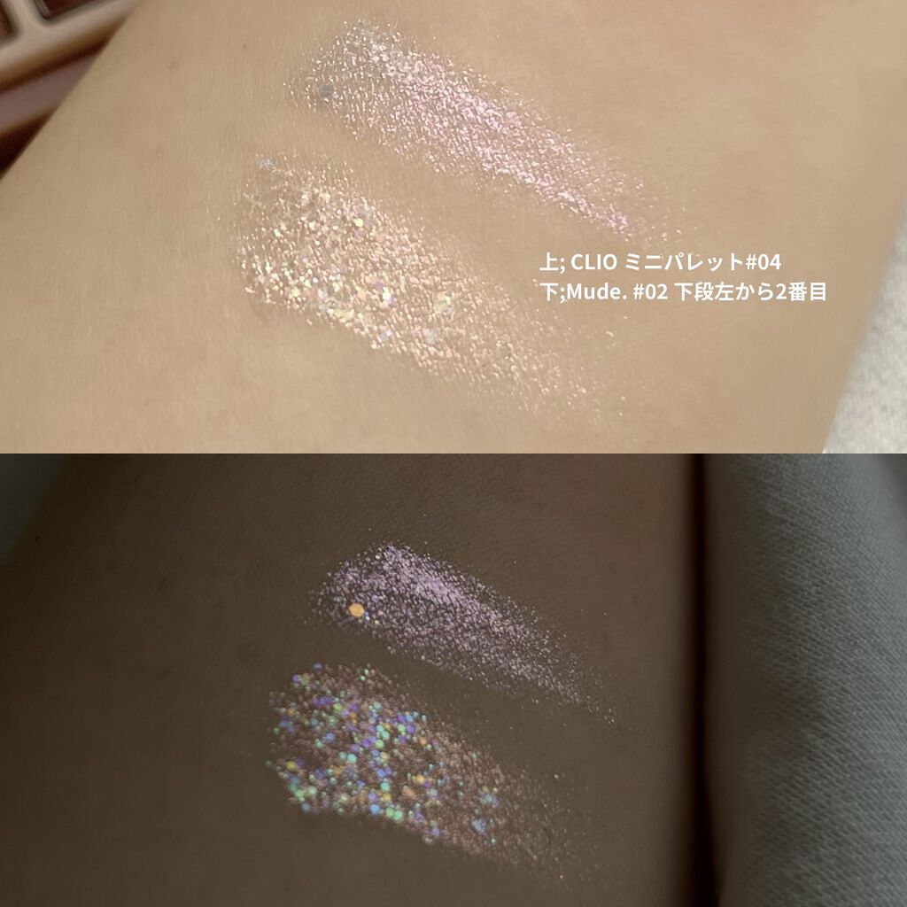 Mude.アイシャドウパレット#02MuseMoment💜使い心地は期待通り良かったです🙆♀️配色バランスも良く発色もしっかりしてくれて、ラメもユニークで可愛い〜!ラメ単体は2色。左の白っぽくみえるラメは、片栗粉っぽい質感で珍しい。塗ると、...