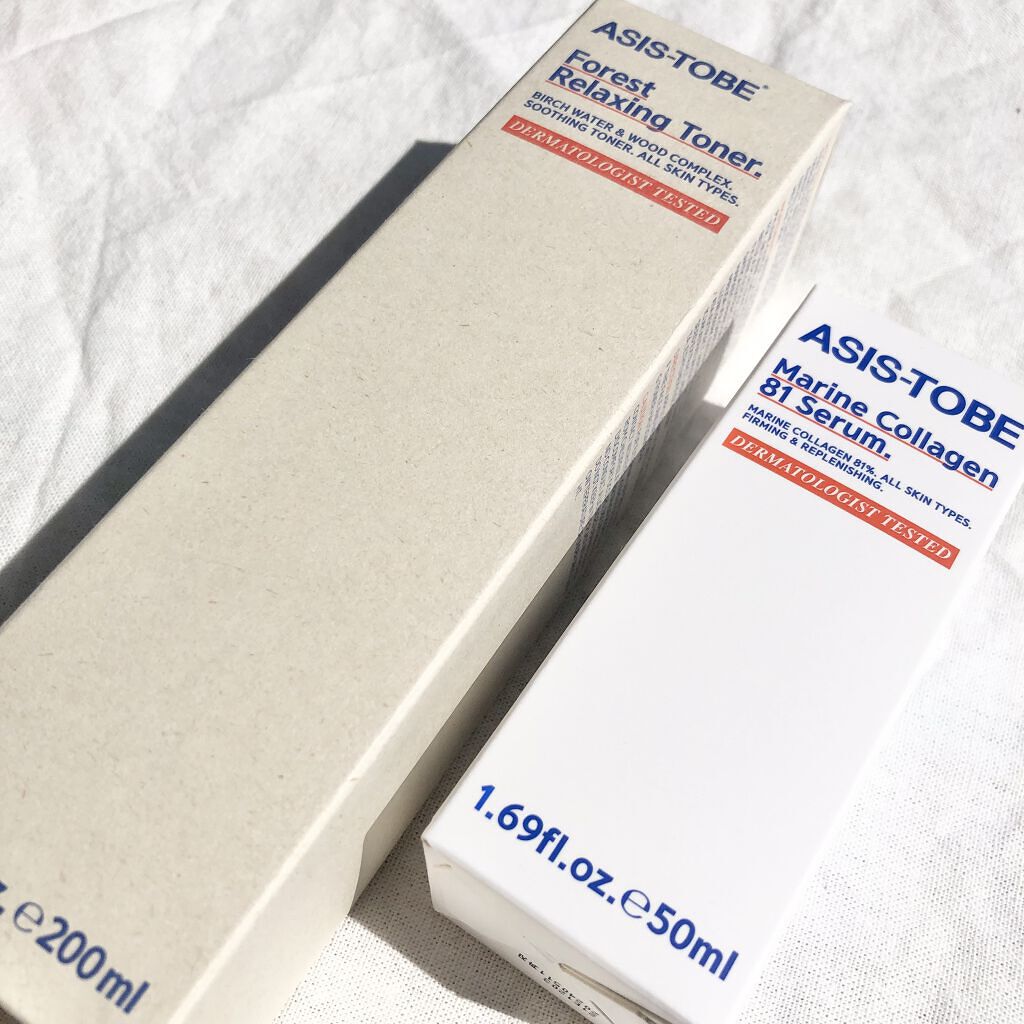 弱酸性でなかなか使い心地よかったです♪ ASIS-TOBE・マリンコラーゲン81セラムマリンコラーゲン配合で高保湿♪もちもち吸い付くようなお肌に♡ ・フォレスト リラクシングトナーサラサラとしたテクスチャーで肌馴染み◎しっとりとしたお肌に♡