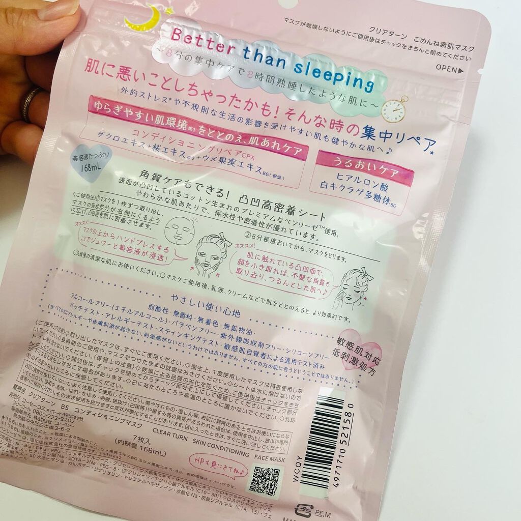 - 【クリアターン ごめんね素肌マスク】 負担をかけて、あれてしまった肌の素肌環境※1をととのえる“速攻集中リペア※2マスク”です。 ① あれがちな肌を素早くコンディションケア! ザクロエキス、桜エキス※3、ウメ果実エキスBG配合し、ゆらぎやすい肌環境をととのえ、肌あれをケアします。また、うるおいケア成分として、ヒアルロン酸、白キクラゲ多糖体BGを配合。外的ストレス※4や不規則な生活の影響を受けやすい肌も健やかでゆらぎにくい肌へみちびきます。 ②敏感肌も使える、弱酸性・低刺激処方 無香料・無着色・無鉱物油・アルコールフリー(エチルアルコール)・パラベンフリー・紫外線吸収剤フリー・シリコーンフリー・パッチテスト済み・アレルギーテスト済み・スティンギングテスト済み・敏感肌自覚者による連用テスト済み(すべての方にアレルギーや皮膚刺激が起きない、刺激感がないというわけではありません。すべての方の肌に合うということではありません。) ③角質ケアもできる!凸凹高密着シート コットン生まれのやわらかな肌触りのベンリーゼを使用。 表面に凸凹のエンボス加工を施しているため、密着性が高く、はがしたマスクでやさしく顔をふきとることで角質ケアもできます。 ※1 うるおい環境のこと ※2 うるおいお手入れのこと ※3 ソメイヨシノ葉エキス、ウメ果実エキスBGはウメ果実エキス・BG(保湿) ※4 乾燥による刺激のこと