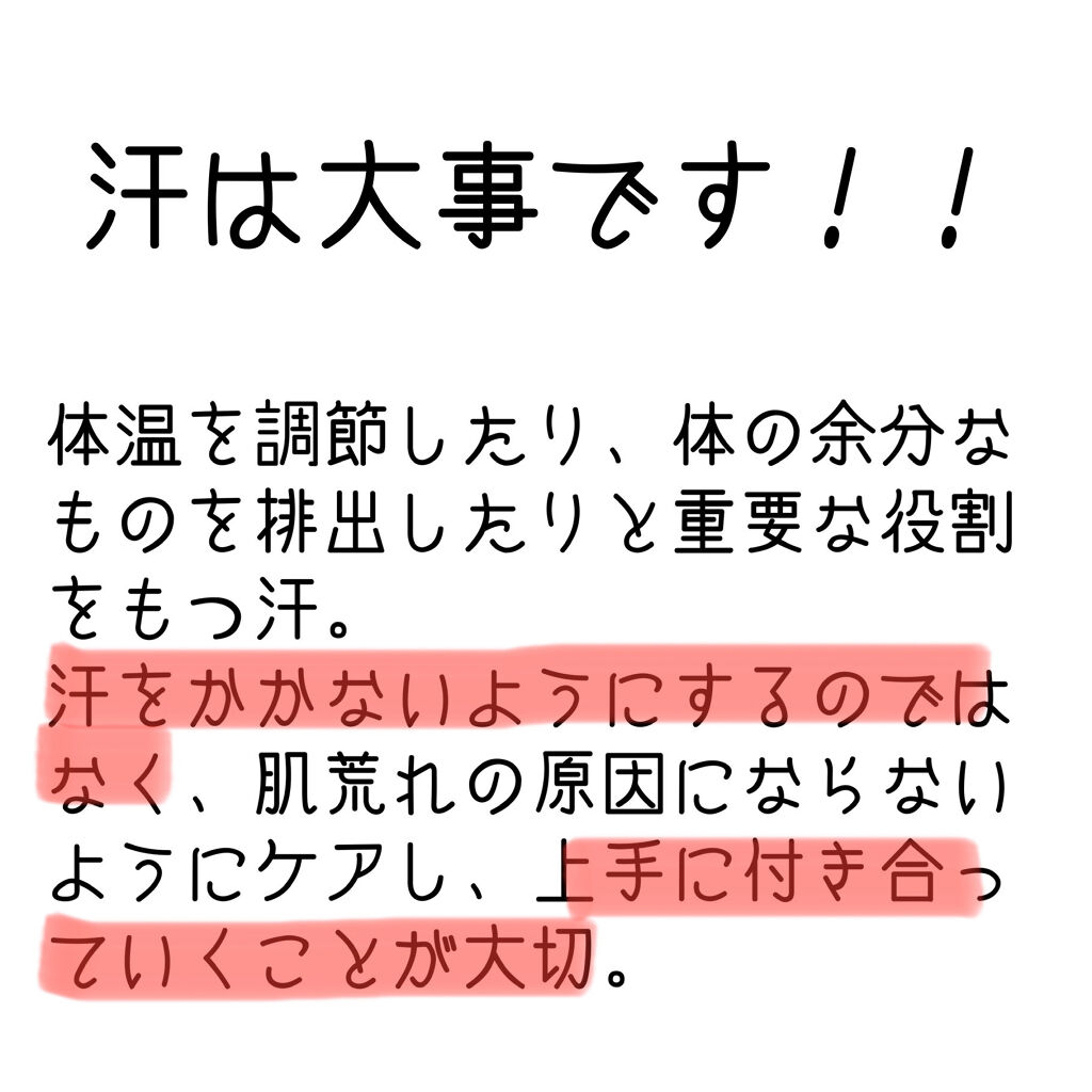 ⚠️放置した汗が肌荒れの原因になっている可能性があります。 ✓汗をかいたまま放置→細菌が繁殖しやすい環境が作られたり乾燥したりすることで肌荒れしやすくなる。 ✓汗にほこりや汚れが付着→汚れが刺激となって肌が敏感に反応することで肌荒れしやすくなる。 肌荒れを防ぐ一番のポイントは、汗を放置しないこと。こまめに&やさしく、すぐに洗い流すか濡らしたタオルなどですぐに拭き取るのが汗による肌荒れを防ぐポイントです。 ⚠️汗は大事です‼️体温を調節したり、体の余分なものを排出したりと重要な役割を持っています。汗をかかないようにするのではなく、肌荒れの原因にならないようにケアし、上手に付き合っていくことが大切です。