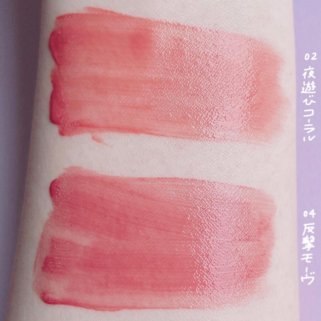 特徴としては、カラー層の上に艶のあるジェル膜が出来て、落ちにくく艶もしっかり出てるんだそう。 唇から蒸発する水分を活用してジェル状の膜を作るケイトのリップモンスターとは似て非なる感じ。 これ本当に、5分くらい放置してるとティッシュオフし忘れてもマスクにつかない😳💫 02 夜遊びコーラルはやや黄みがかった明るめピンクでパーソナルカラーではSpringの方におすすめのカラー🥰 04 反撃モーヴは青みのピンクなのでブルベさん向け🥰 リップモンスターが割としっとりと保湿感のある落ちないリップだったのに対し、リップアーマーの方がよりうるみを感じるちゅるっと感。