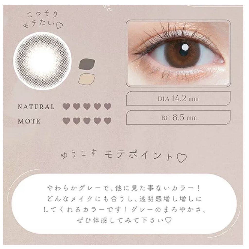 やわらか細フチとベージュが立体感のある瞳に。 このベージュ、のっぺりせずにぷるんとした質感になるの!すごい👏 じゅわっとグレーが透明感爆上がり…!🥹 イエベさんも馴染みそうなグレー♡♡ 生まれつき瞳の色素が薄いようなまさに天然茶目レンズ🪄