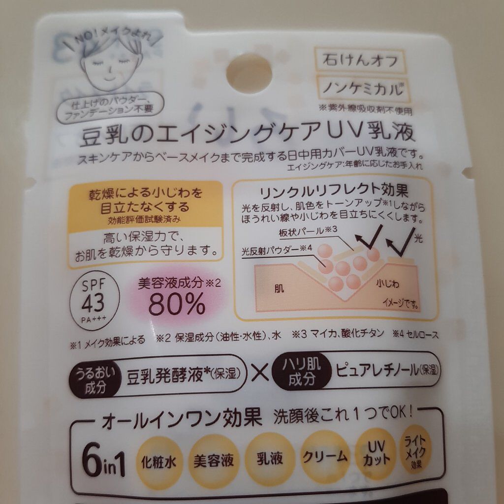 - ほうれい線・小じわのメイクよれが気になる方におすすめの日中用カバーUV 乳液です。リニューアルしたなめらか本舗エイジングケア*1ライン共通の、滋賀県産たまほまれ使用の豆乳発酵液*2とピュアレチノール*2を配合しています。リンクルリフレクト効果で、ほうれい線や小じわを目立たなくし、時間が経ってもメイクよれが気にならない処方を採用しました。お肌にうれしいノンケミカル(紫外線吸収剤不使用)処方で、洗顔後これ 1 つでスキンケアからベースメイクまで完成。 乾燥による小じわを目立たなくします(効能評価試験済み)。 SPF43・PA+++、石けんでオフできます。 *1年齢に応じたお手入れ *2保湿成分