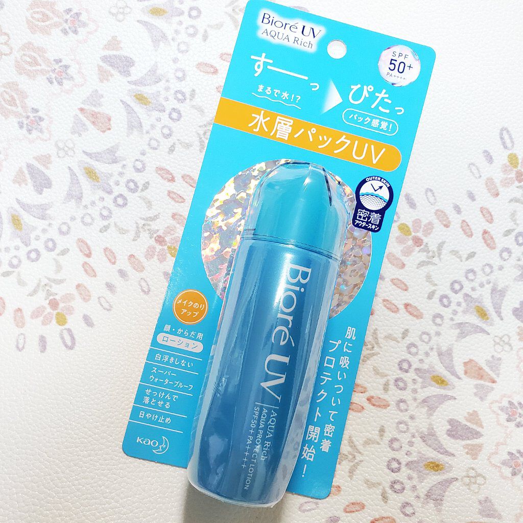 ビオレUVアクアリッチアクアプロテクトローションを使ってみたよ🩵SPF50+PA++++顔とからだ両方使用可!メイクのりをUPさせてくれて、水光肌みたいなツヤ感も出るから気に入ってる🩵UVカット成分が含まれたアクアカプセルが入ってるよ✨想像よ...