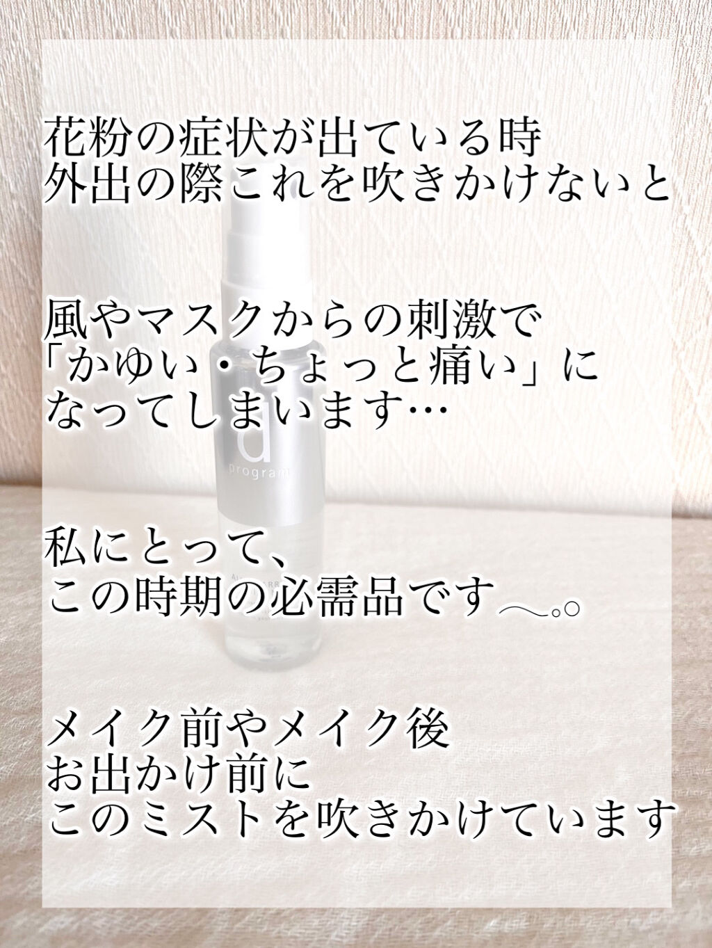 dプログラムのミストは、花粉やちりほこりで肌荒れに悩んでる人に着目した商品。 私にはお守りすぎて大切な存在。これが無いと肌が荒れて萎えます( ; ; ) 出かける前に4回顔にふりかけて終わり!潤いもあって、バリア機能もありこの時期にはもってこい!試したことない人はぜひ試してみて!! 花粉で肌荒れ悩んでる人必見!