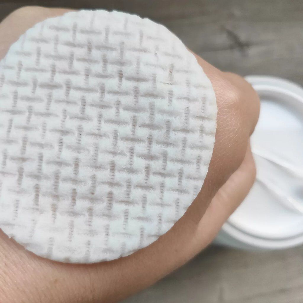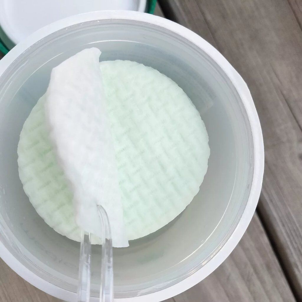 朝の拭き取りに、メイク前に保湿して崩れ防止になど、多機能で使えるトナーパッド。 美容液が170mlも入っていて、取り出して使うとかなりヒタヒタなのでしっとり潤います。 素材はピュアビタミンC原糸と竹由来の繊維からできています。 両面色が違い、薄い方がふき取りに適していて、濃い方はパックに適している方。 毎朝デコルテまで必ず拭き取っているので、一枚はふき取り用に使い、乾燥が気になる日はオレンジ面を頬に重ねて簡易パックに使っていました。