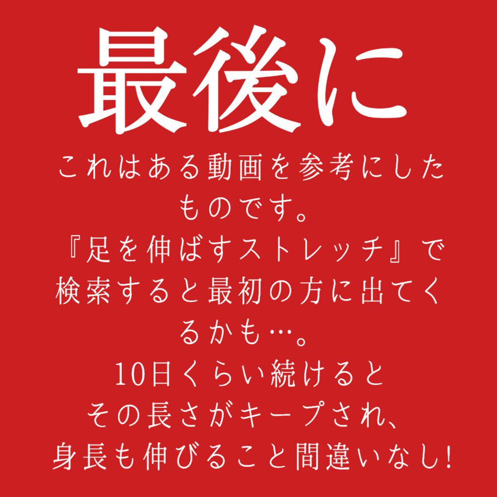 たった38秒で伸びる! 10日くらい続けるとその長さがキープされる! 実際私も効果あったし💦 『脚が伸びるストレッチ』で検索すると最初の方に出てきます。 身長も伸びてスタイル良くなっていいコトたくさん!