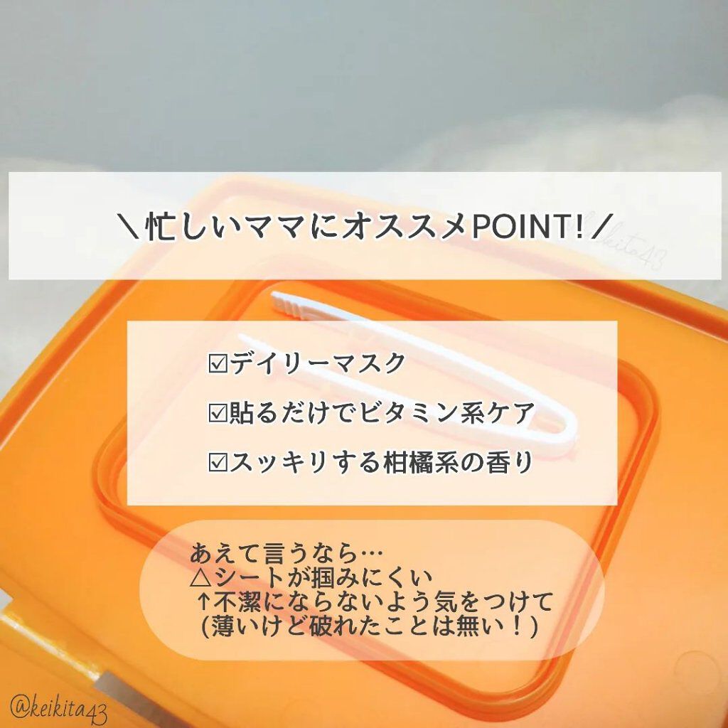 | スキンケアランキング第49位 | シートがみかん色でびっくり! とろっとろの液が含まれていて 貼り付けたらぴたーっとくっついてすごく気持ちいい! | 詳細を見る | |
