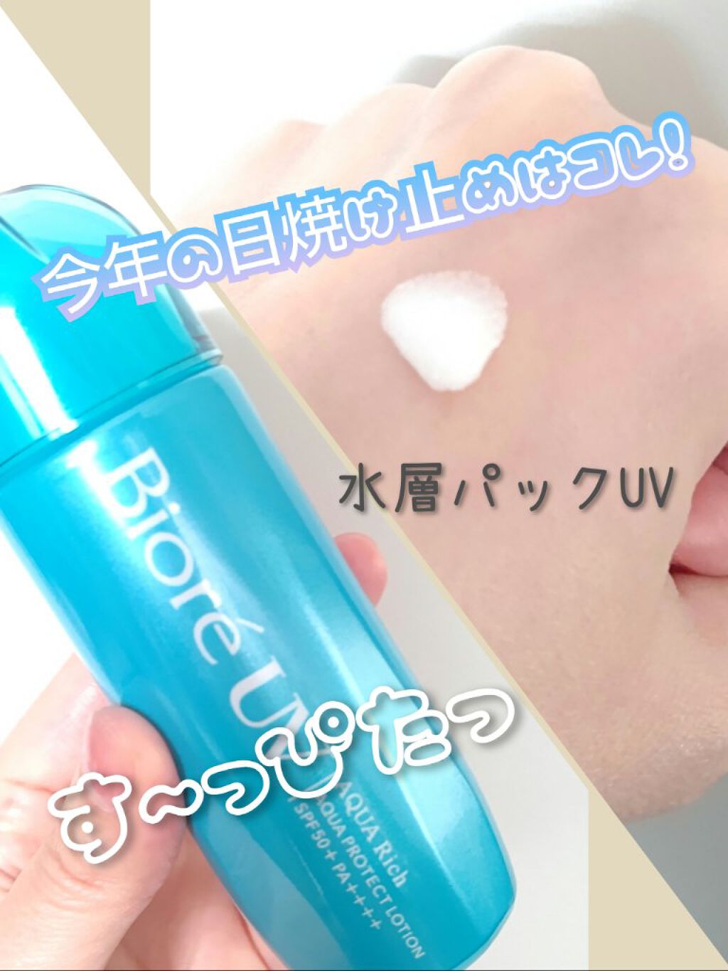 - 「すーっぴたっ」まるで水のように「すーっ」と広がって、「ぴたっ」と肌に吸いつき密着。 パック感覚に変化し、プロテクト開始!水層パックUV ・SPF50+ PA++++ ・素早くなじんで、白浮きしない。透明感あるツヤ肌に仕上がる ・肌がうるおって、メイクのりアップ ・スーパーウォータープルーフなのにせっけんで落とせる ・ニキビになりにくい処方(ノンコメドジェニックテスト済み*1) ・アレルギーテスト済み*1 *1 すべての方にコメド(ニキビのもと)ができない、アレルギーが起こらないというわけではありません