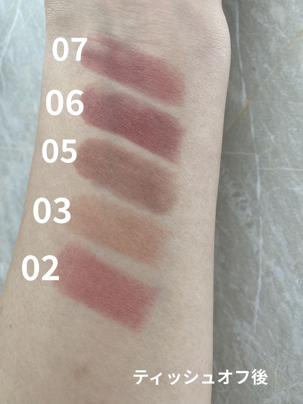 マスクやカップにつきにくく色持ちも良かった( ¨̮ )/飲食後は内側から取れていく感じです🙌縁の部分は綺麗に残っていてお直しもしやすいかなと思います💖 初めてのマットリップでしたがこの質感はすごいっ!!泥リップに納得です🙌笑仕上がりはスフレのようにふわっとした唇に💋縦ジワも目立ちにくかったです🙋♀️ マットリップといえば乾燥するイメージがあるけどんぱんぱした時に、少しオイリーさがあって乾燥は気にならなかったです🙌 •ふわふわ唇が完成します💋•簡単にグラデーションが作れます!•リップ、アイシャドウなどマルチに使える•ほんのりチョコレートな香りがたまらん🥺💕