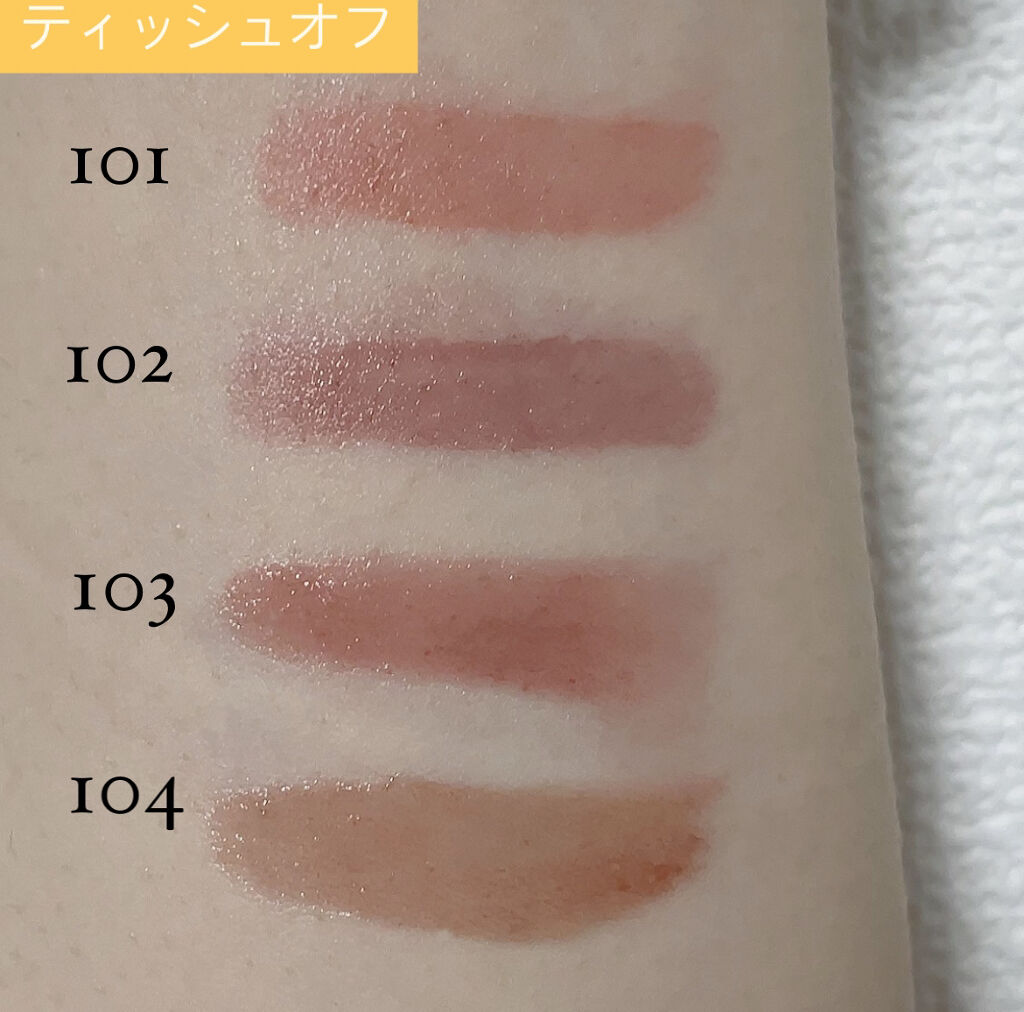 - <101 ジョイフル> 水、リンゴ酸ジイソステアリル、ダイマージリノール酸(フィトステリル/イソステアリル/セチル/ステアリル/ベヘニル)、ジイソステアリン酸ダイマージリノレイル、ノナイソステアリン酸ポリグリセリル-10、オクチルドデカノール、ビスジグリセリルポリアシルアジペート-2、水添ポリイソブテン、セチルPEG/PPG-10/1ジメチコン、ポリソルベート60(小麦由来)、イソステアリン酸ソルビタン(小麦由来)、1,2-ヘキサンジオール、グリセリン、ベヘニルアルコール、(アクリル酸/MA)コポリマーNa、ペンチレングリコール、BG、ポリアクリレート-13、トロメタミン、(アクリレーツ/アクリル酸アルキ ル(C10-30 )クロスポリマー、エチルヘキシルグリセリン、ポリイソブテン、(アクリル酸ヒドロキシエチル/アクリロイルジメチルタウリンNa)コポリマー、スクワラン、デヒドロ酢酸、ステビオシド、香料、フィチン酸、カプリリルグリコール、ジメチコン、水添ロジン酸メチル、水酸化Al、ポリソルベート20(小麦由来)、トコフェロール、ライム果汁、キイチゴ果汁、レモン果汁、マンゴー果汁、フラガリアチロエンシス果汁、アンズ果汁、オレンジ果汁、グレープフルーツ液汁、キウイ果汁、パパイア果汁、[+/-]酸化チタン、黄4、黄5、赤 104(1)、赤227、青1 <102 デューイ> 水、リンゴ酸ジイソステアリル、ダイマージリノール酸(フィトステリル/イソステアリル/セチル/ステアリル/ベヘニル)、ジイソステアリン酸ダイマージリノレイル、ノナイソステアリン酸ポリグリセリル-10、オクチルドデカノール、ビスジグリセリルポリアシルアジペート-2、水添ポリイソブテン、セチルPEG/PPG-10/1ジメチコン、ポリソルベート60(小麦由来)、イソステアリン酸ソルビタン(小麦由来)、1,2-ヘキサンジオール、グリセリン、ベヘニルアルコール、(アクリル酸/MA)コポリマーNa、ペンチレングリコール、BG、ポリアクリレート-13、トロメタミン、(アクリレーツ/アクリル酸アルキル(C10-30))クロスポリマー、エチルヘキシルグリセリン、ポリイソブテン、(アクリル酸ヒドロキシエチル/アクリロイルジメチルタウリンNa)コポリマー、スクワラン、デヒドロ酢酸、ステビオシド、香料、フィチン酸、ジメチコン、水添ロジン酸メチル、水酸化Al、カプリリルグリコール、ポリソルベート20(小麦由来)、トコフェロール、ライム果汁、キイチゴ果汁、レモン果汁、マンゴー果汁、フラガリアチロエンシス果汁、アンズ果汁、オレンジ果汁、グレープフルーツ液汁、キウイ果汁、パパイア果汁、酸化チタン、赤227、黄5、黄4、青1 <103 ハミング> 水、リンゴ酸ジイソステアリル、ダイマージリノール酸(フィトステリル/イソステアリル/セチル/ステアリル/ベヘニル)、ジイソステアリン酸ダイマージリノレイル、ノナイソステアリン酸ポリグリセリル-10、オクチルドデカノール、ビスジグリセリルポリアシルアジペート-2、水添ポリイソブテン、セチルPEG/PPG-10/1ジメチコン、ポリソルベート60(小麦由来)、イソステアリン酸ソルビタン(小麦由来)、1,2-ヘキサンジオール、グリセリン、ベヘニルアルコール、(アクリル酸/MA)コポリマーNa、ペンチレングリコール、BG、ポリアクリレート-13、トロメタミン、(アクリレーツ/アクリル酸アルキル(C10-30))クロスポリマー、エチルヘキシルグリセリン、ポリイソブテン、(アクリル酸ヒドロキシエチル/アクリロイルジメチルタウリンNa)コポリマー、スクワラン、デヒドロ酢酸、ステビオシド、香料、フィチン酸、ジメチコン、水添ロジン酸メチル、水酸化Al、カプリリルグリコール、ポリソルベート20(小麦由来)、トコフェロール、ライム果汁、キイチゴ果汁、レモン果汁、マンゴー果汁、フラガリアチロエンシス果汁、アンズ果汁、オレンジ果汁、グレープフルーツ液汁、キウイ果汁、パパイア果汁、酸化チタン、黄5、赤227、青1 <104 チェリー> 水、リンゴ酸ジイソステアリル、ダイマージリノール酸(フィトステリル/イソステアリル/セチル/ステアリル/ベヘニル)、ジイソステアリン酸ダイマージリノレイル、ノナイソステアリン酸ポリグリセリル-10、オクチルドデカノール、ビスジグリセリルポリアシルアジペート-2、水添ポリイソブテン、セチルPEG/PPG- 10/1ジメチコン、イソステアリン酸ソルビタン(小麦由来)、ポリソルベート60(小麦由来)、1,2-ヘキサンジオール、グリセリン、ベヘニルアルコール、(アクリル酸/MA)コポリマーNa、ペンチレングリコール、BG、ポリアクリレート-13、ト ロメタミン、(アクリレーツ/アクリル酸ア ルキル(C10-30))クロスポリマー、エチルヘキシルグリセリン、ポリイソブテ ン、(アクリル酸ヒドロキシエチル/アクリ ロイルジメチルタウリンNa)コポリマー、スクワラン、デヒドロ酢酸、ステビオシド、香料、カプリリルグリコール、ポリソルベー ト20(小麦由来)、トコフェロール、ライム果汁、キイチゴ果汁、レモン果汁、マンゴー 果汁、フラガリアチロエンシス果汁、アンズ 果汁、オレンジ果汁、グレープフルーツ液 汁、キウ