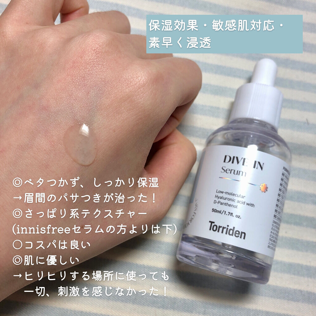 韓国コスメ評価アプリファヘビューティーアワード 3年連続1位* 2023年オリーブヤングアワード エッセンス/セラム部門3位受賞の実績もあって使うと納得する使い心地 シンプルな処方となっていて成分は5種類のヒアルロン酸やD-パンテノールアラントインだからどんなスキンケアとも相性が良く攻め系成分のスキンケアとも相性◎ ダイブインセラムの長所を1枚に詰め込んだダイブインマスク。 2つとも使用することで水分爆弾!!