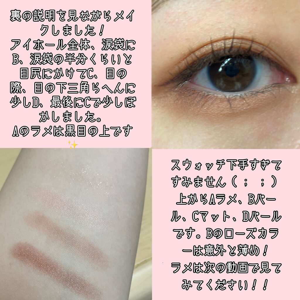 全6色中5色所持してます! 05 ライラックベージュはもろブルベ向けだな、と思って買ってない🫥 4色パレットがこの値段で買えるなんて、、 これひとつでアイメイクが済ませられるから時間のない朝のお仕事メイクにぴったり💫 今度ペールトーンアイシャドウの新色が出るみたいだから絶対ゲットしたい✊🏻💖