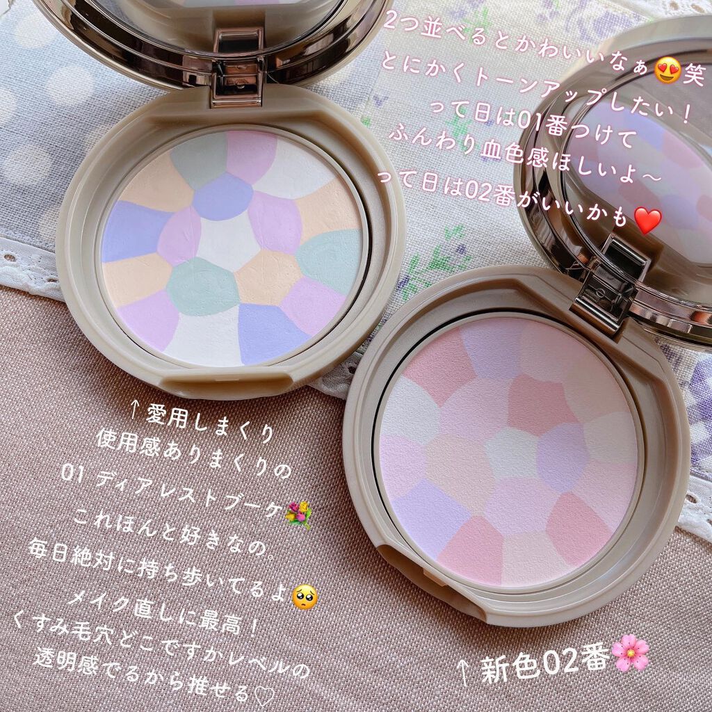 - <01 ディアレストブーケ> タルク、酸化チタン、メトキシケイヒ酸エチルヘキシル、マイカ、ラウロイルリシン、ワセリン、シリカ、ミリスチン酸亜鉛、リンゴ酸ジイソステアリル、(ビニルジメチコン/メチコンシルセスキオキサン)クロスポリマー、ヒドロキシアパタイト、DPG、含水シリカ、酸化亜鉛、酸化鉄、水酸化Al、エチルパラベン、メチルパラベン、イソステアリン酸ソルビタン、ジメチコン、エチルヘキシルグリセリン、カプリリルグリコール、水、ハイドロゲンジメチコン、デヒドロ酢酸Na、酸化スズ、ステアロイルグルタミン酸2Na、BG、アルガニアスピノサ核油、スクワラン、ホホバ種子油、水添ポリイソブテン、PG、BHT、エタノール、ヒアルロン酸Na、フェノキシエタノール、ユキノシタエキス、チャ葉エキス、カミツレ花エキス、センチフォリアバラ花エキス、クエン酸、水溶性コラーゲン、アルニカ花エキス、セイヨウオトギリソウ花/葉/茎エキス、セイヨウキズタ葉/茎エキス、セイヨウトチノキ種子エキス、ハマメリス葉エキス、ブドウ葉エキス、クエン酸Na、グンジョウ、黄4、赤226 <02 サクラチュール> タルク、酸化チタン、メトキシケイヒ酸エチルヘキシル、マイカ、ラウロイルリシン、ワセリン、シリカ、ミリスチン酸亜鉛、リンゴ酸ジイソステアリル、(ビニルジメチコン/メチコンシルセスキオキサン)クロスポリマー、ヒドロキシアパタイト、DPG、含水シリカ、酸化亜鉛、水酸化Al、エチルパラベン、メチルパラベン、イソステアリン酸ソルビタン、ジメチコン、エチルヘキシルグリセリン、カプリリルグリコール、水、酸化鉄、ハイドロゲンジメチコン、デヒドロ酢酸Na、酸化スズ、ステアロイルグルタミン酸2Na、BG、アルガニアスピノサ核油、スクワラン、ホホバ種子油、水添ポリイソブテン、PG、BHT、エタノール、ヒアルロン酸Na、フェノキシエタノール、ユキノシタエキス、チャ葉エキス、カミツレ花エキス、センチフォリアバラ花エキス、クエン酸、水溶性コラーゲン、アルニカ花エキス、セイヨウオトギリソウ花/葉/茎エキス、セイヨウキズタ葉/茎エキス、セイヨウトチノキ種子エキス、ハマメリス葉エキス、ブドウ葉エキス、クエン酸Na、グンジョウ、赤226、黄4 <03 プルメリアリース> タルク、酸化チタン、メトキシケイヒ酸エチルヘキシル、マイカ、ラウロイルリシン、ワセリン、シリカ、ミリスチン酸亜鉛、リンゴ酸ジイソステアリル、(ビニルジメチコン/メチコンシルセスキオキサン)クロスポリマー、ヒドロキシアパタイト、DPG、含水シリカ、酸化亜鉛、エチルパラベン、メチルパラベン、イソステアリン酸ソルビタン、ジメチコン、水酸化Al、カプリリルグリコール、エチルヘキシルグリセリン、水、ハイドロゲンジメチコン、デヒドロ酢酸Na、酸化スズ、BG、ステアロイルグルタミン酸2Na、アルガニアスピノサ核油、スクワラン、ホホバ種子油、水添ポリイソブテン、PG、BHT、エタノール、ヒアルロン酸Na、フェノキシエタノール、ユキノシタエキス、チャ葉エキス、カミツレ花エキス、トコフェロール、センチフォリアバラ花エキス、クエン酸、水溶性コラーゲン、アルニカ花エキス、セイヨウオトギリソウ花/葉/茎エキス、セイヨウキズタ葉/茎エキス、セイヨウトチノキ種子エキス、ハマメリス葉エキス、ブドウ葉エキス、クエン酸Na、黄4、酸化鉄、グンジョウ、マンガンバイオレット、赤226、カオリン、コンジョウ <01 ディアレストブーケ(リフィル)> タルク、酸化チタン、メトキシケイヒ酸エチルヘキシル、マイカ、ラウロイルリシン、ワセリン、シリカ、ミリスチン酸亜鉛、リンゴ酸ジイソステアリル、(ビニルジメチコン/メチコンシルセスキオキサン)クロスポリマー、ヒドロキシアパタイト、DPG、含水シリカ、酸化亜鉛、酸化鉄、水酸化Al、エチルパラベン、メチルパラベン、イソステアリン酸ソルビタン、ジメチコン、エチルヘキシルグリセリン、カプリリルグリコール、水、ハイドロゲンジメチコン、デヒドロ酢酸Na、酸化スズ、ステアロイルグルタミン酸2Na、BG、アルガニアスピノサ核油、スクワラン、ホホバ種子油、水添ポリイソブテン、PG、BHT、エタノール、ヒアルロン酸Na、フェノキシエタノール、ユキノシタエキス、チャ葉エキス、カミツレ花エキス、センチフォリアバラ花エキス、クエン酸、水溶性コラーゲン、アルニカ花エキス、セイヨウオトギリソウ花/葉/茎エキス、セイヨウキズタ葉/茎エキス、セイヨウトチノキ種子エキス、ハマメリス葉エキス、ブドウ葉エキス、クエン酸Na、グンジョウ、黄4、赤226 <02 サクラチュール(リフィル)> タルク、酸化チタン、メトキシケイヒ酸エチルヘキシル、マイカ、ラウロイルリシン、ワセリン、シリカ、ミリスチン酸亜鉛、リンゴ酸ジイソステアリル、(ビニルジメチコン/メチコンシルセスキオキサン)クロスポリマー、ヒドロキシアパタイト、DPG、含水シリカ、酸化亜鉛、水酸化Al、エチルパラベン、メチルパラベン、イソステアリ