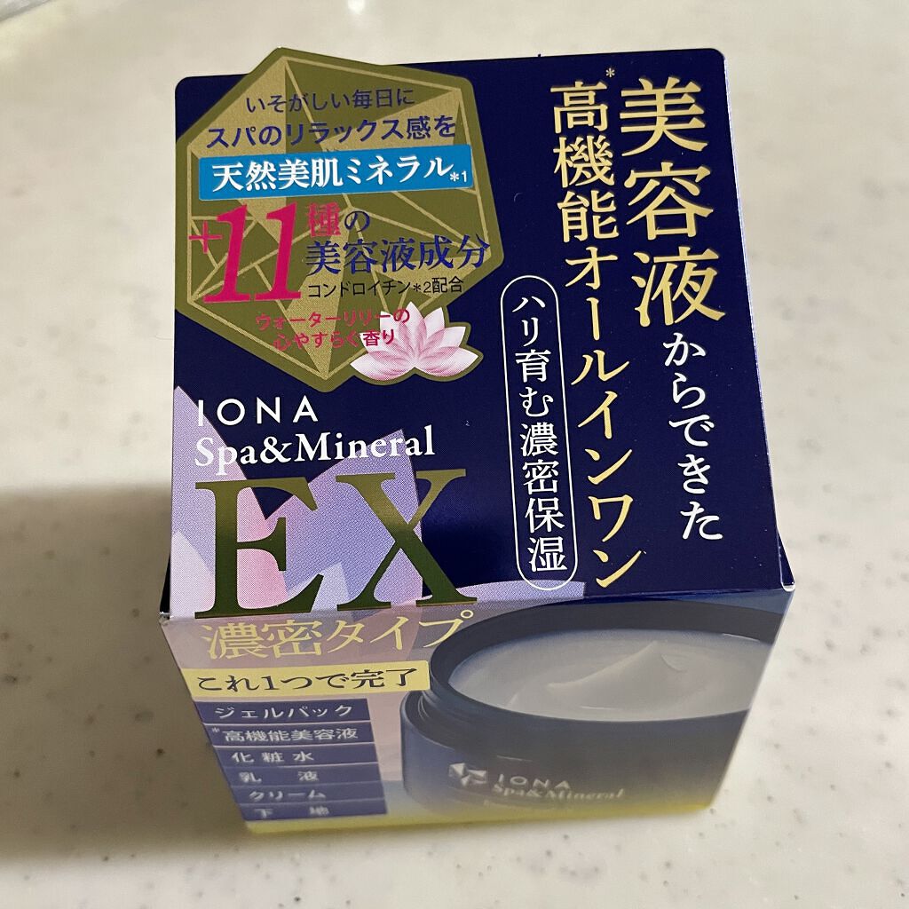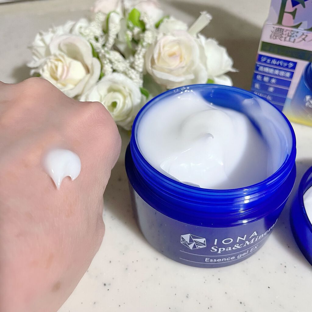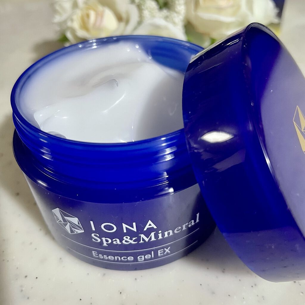 「イオナスパ&ミネラル エッセンスジェルEX」 美容液ジェル 80gトロリと濃密なオールインワンジェルです濃い青の、使いやすいジャータイプの容器に入っています✨手に取ってみると、トロリとした白いジェルクリームです✨なめらかで濃厚なテ...