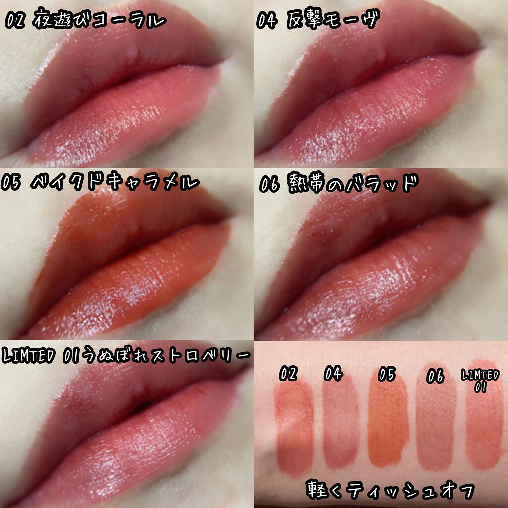 べたつかず水分をたっぷりしっとりした艶 なのに軽いテクスチャーでとっても塗りやすい🫶 うるちゅるむっちりで可愛い❤️❤️ 色持ちも良きでした🙆♀️ Dintのシックなパケも好み♡ 推しリップが増えて嬉しい❤️❤️