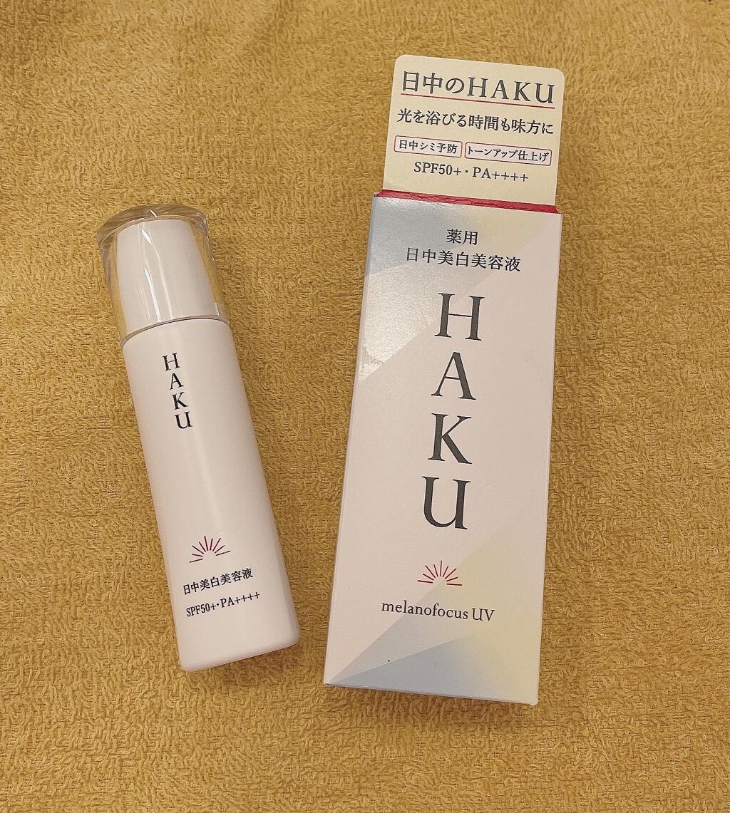 - 販売名「メラノフォーカスUV」 SPF50+・PA++++ 日中のHAKU。光を浴びる時間も味方に、日中だからできる美白ケアのアプローチ。 シミ予防研究の先端技術を搭載し、日中ならではの美白ケアを可能にした、薬用日中美白美容液です。光を浴びる時間も味方にして、明るく透明感のある肌に導きます。 ○2種の美白有効成分を肌の奥まで届け効かせる。 ○日中の肌環境に着目し、Wデイエフェクターを配合。うるおいを与え届ける。 〇ファインレッドパールαが効果的に光を放ち、シミや色ムラを目立たせない。トーンアップ効果で、明るく透明感のある仕上がり。 〇みずみずしい美容液がスーッとなじむ。化粧下地としても使える。 ○無香料・アレルギーテスト済み・ニキビのもとになりにくい処方。 (全てのかたにアレルギーが起きない、ニキビができないというわけではありません)。