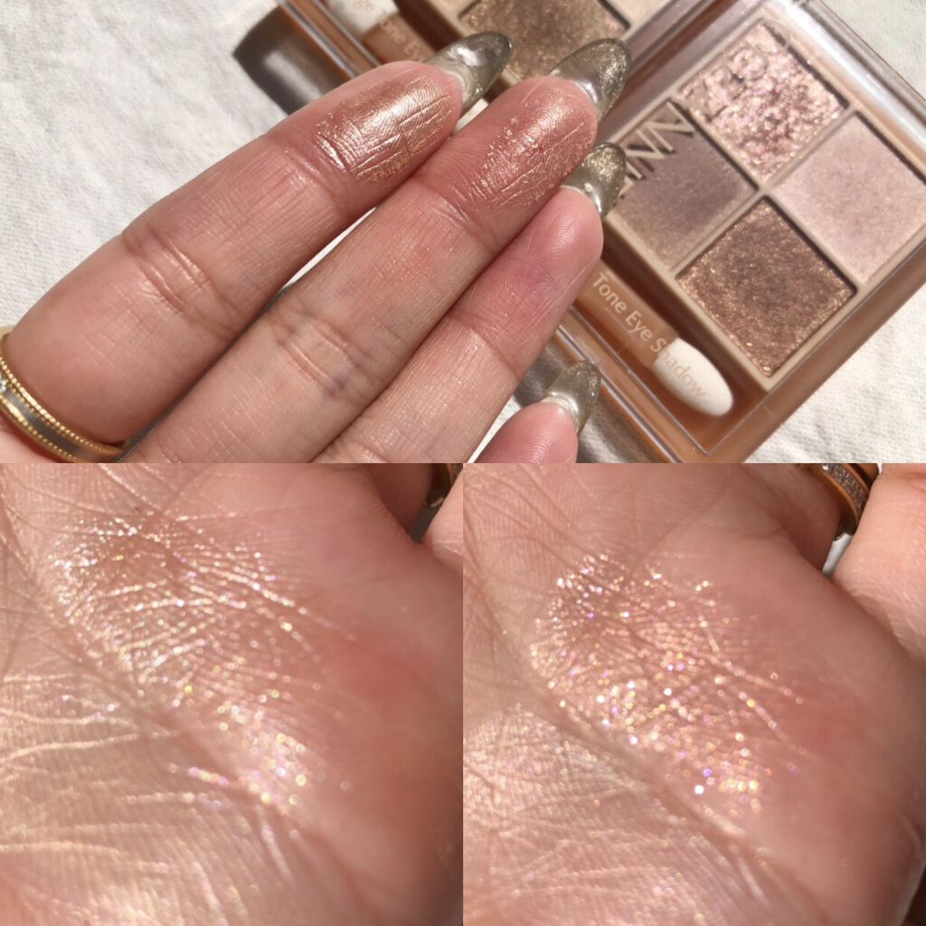 肌なじみのいいベージュトーンのパレット♡ シマー・マット・ラメの3質感がセットされていて、カラーと質感両方を楽しめる💕 粉質はしっとり密着するパウダータイプ。パレで見たイメージよりも、肌に塗ったほうが発色よく感じたよ◎ 春は上2色を使ってミュートな透明感メイクにも使いたい・・・!