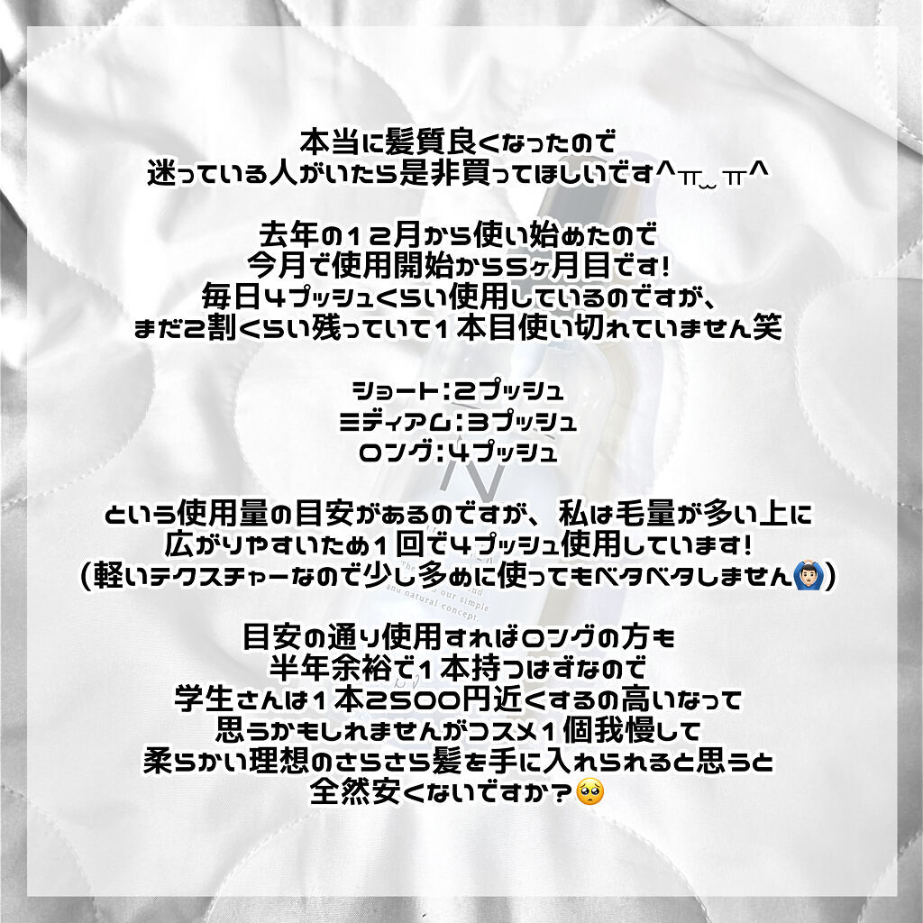 | ヘアケア・スタイリングランキング第29位 | 髪の毛がまとまりやすく、扱いやすくなった感じがして嬉しい🥰 べたつかないさらっと軽やかな使い心地で、手もべたつないから終始快適 | 詳細を見る | |