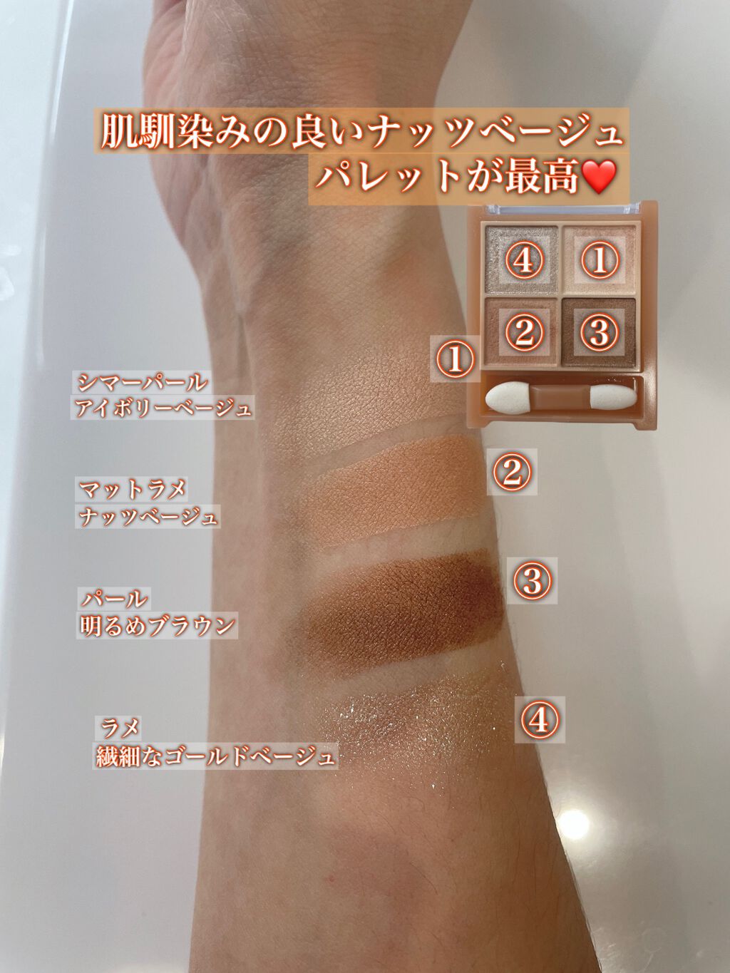 - ラメ・パール・マット3質感の4色アイシャドウ。 肌馴染みの良いベージュを基調としたカラー。ラメ・パール・マットの3質感を重ねて、自然にまぶたを強調し奥行のある大きな目元へ。 しっとり溶け込むような柔らかなパウダーなので、スルスル伸びてまぶたにピタッと密着。保湿成分(スクワラン・ホホバ種子油)配合。