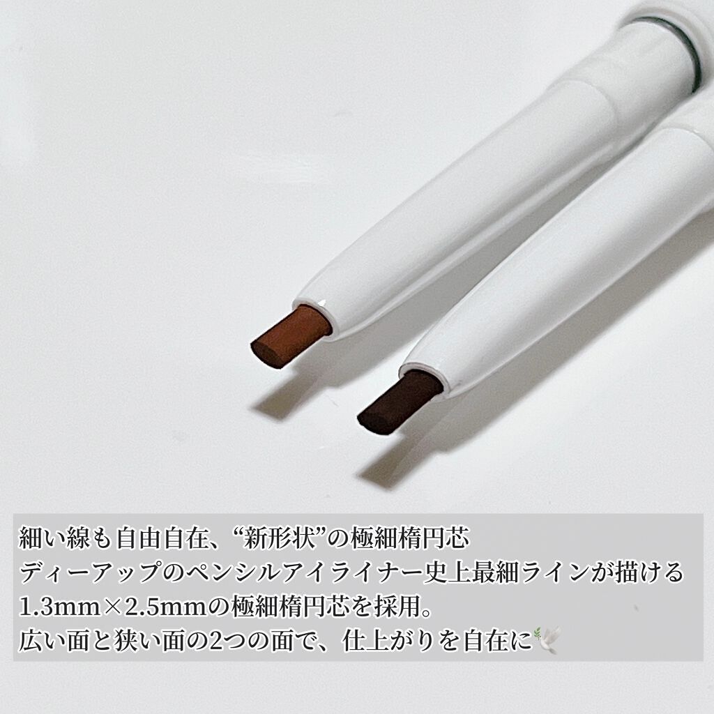 - ※2024年9月〜パッケージ順次リニューアル。尚、これにかかる商品の返品・交換は承っておりません。 「軽くてエアリー、なめらかクリーミィ」 ホイップを固めたような“ふわとろ”質感の新アイライナー ▶摩擦を抑えた描き心地!触れるだけで“スーッ”とほどける「空気感タッチ」 なめらかな描き心地で、まつ毛の隙間や肌の凹凸に引っかからずに狙い通りにラインが描ける。 ▶新形状の極細楕円芯!「キワ埋め」も「目尻」も自在 狙った場所に自在に描ける「1.3㎜×2.5㎜」の新形状。極細ラインもテクニックレス。 ▶ピタッと高密着!高い耐久性。水汗皮脂に強いスーパーウォータープルーフ* まぶたにピタッと密着して、マスクでもよれにくい。 *ディーアップ アイライナーにおいて ・シナモンブラウン “肌になじむ、柔らか 抜け感くすみブラウン” 抜け感と締め感を両立し、ナチュラルに盛れる ・ピーチブラウン “ビターなほんのり赤み系ブラウン” まるでまつ毛の密度が上がったように、自然に目元を大きく見せる ・ソイラテブラウン (2022年10月9日発売) 肌にふわっと溶け込む、まろやかな“ラテカラー” 軽やかなのに深みのある色味で自然と瞳を強調