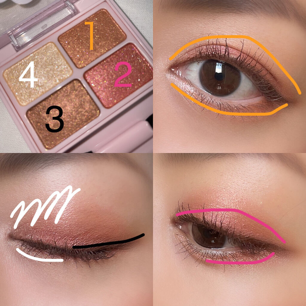 全体的に淡めです! イエベ向きな黄色みのあるブラウン系🤎 シマーなラメが可愛すぎる!! 密着度の高いラメでポンと乗せるだけで キラッキラ✨✨ 粉飛びもしないです! 発色はいいですが淡いので 初心者さんでも使いやすい!!!