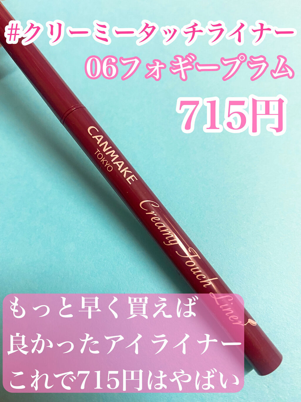キャンメイククリーミータッチライナー06フォギープラムプチプラのアイライナーキャンメイクのクリーミータッチライナーだよね。いつも、フォギープラムを買うなぁ。フォギープラムの色が好き🥰たまには、他の色も買おうかなぁ。。。キャンメイクのクリーミー...