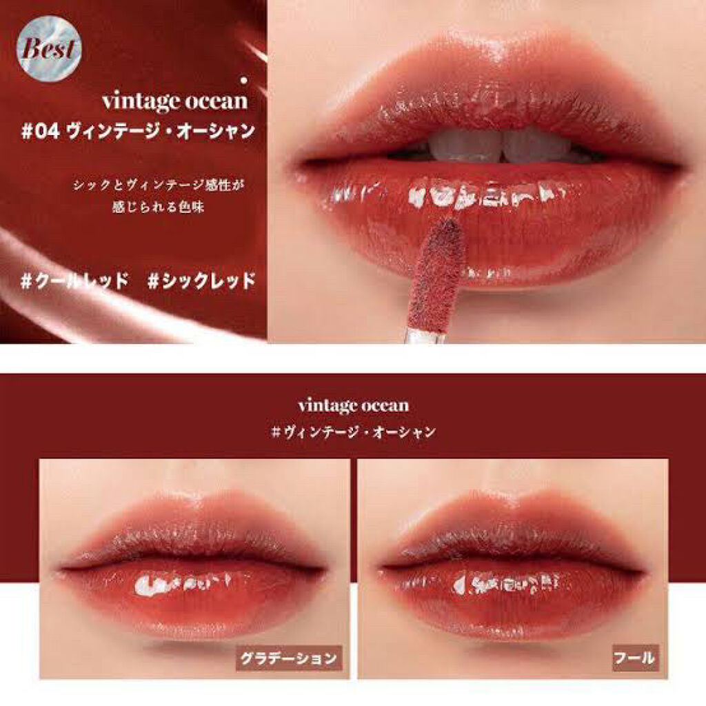 私はリピなし🥲可愛いのに残念だったティント…♡rom&ndグラスティングウォーターティント14MAUVEMOON¥1,320このシリーズのティントは初めて購入しましたがまず、色持ちはすごく良かったです!!飲んだり食べたりしてもきちんと色が残っ...